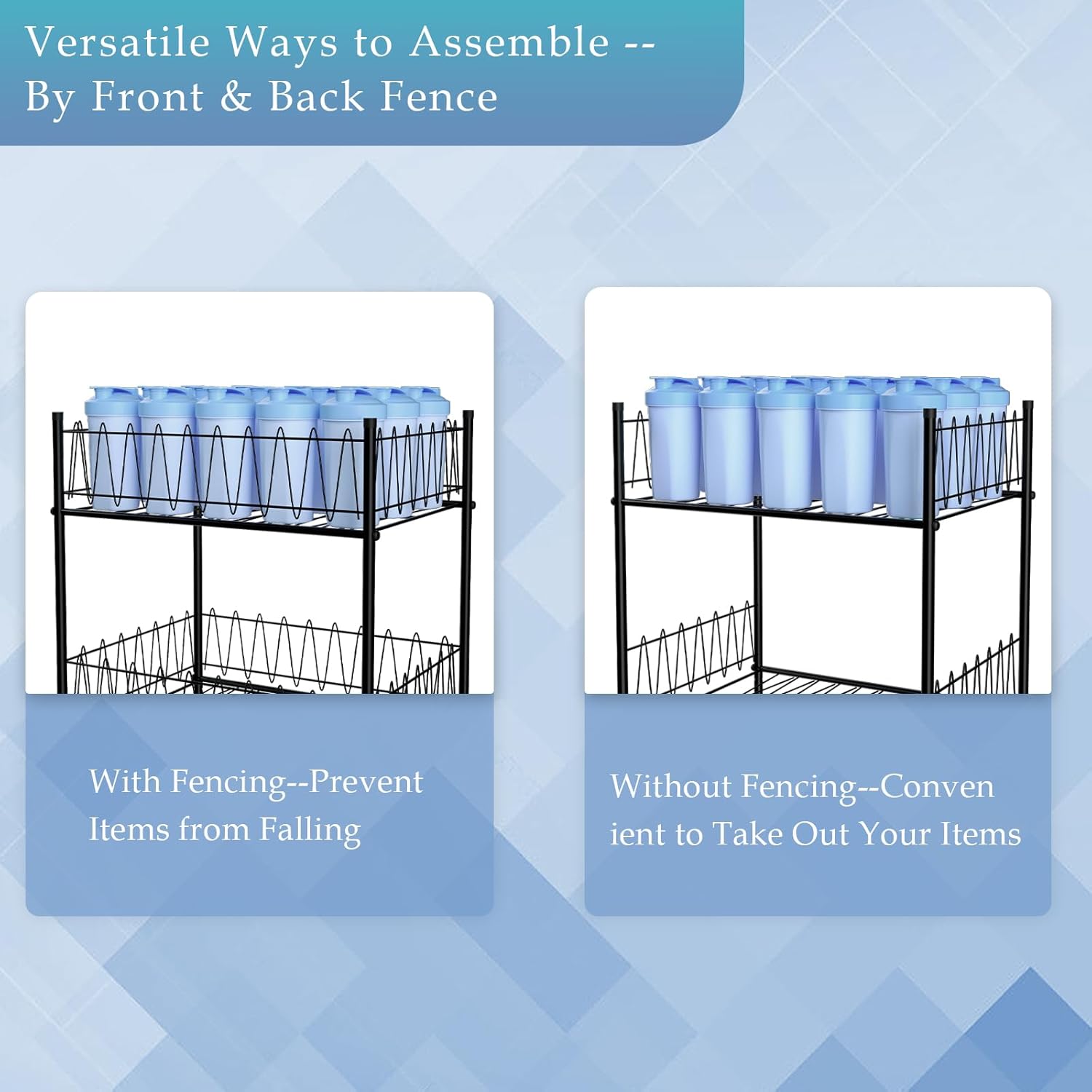 - ăMetal Frame & Adjustable FeetăThe water bottle organizer is made of metal material, which ensures the water bottle holder cooler jug rack organizer's stability and durability. Besides, coated surface makes the water bottle rack waterproof and can avoids to rust. 4 adjustable feet can also makes the kitchen storage rack still stand on the uneven ground.