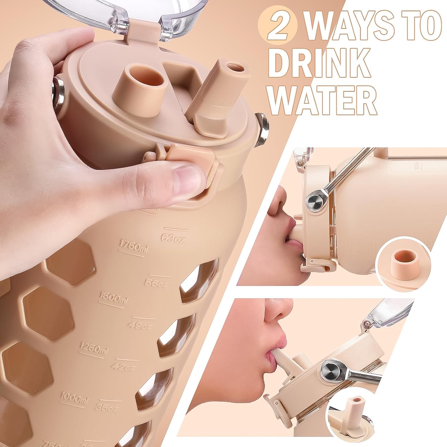 MUKOKO 64oz Glass Water Bottles with Straw and Lid,Half Gallon Water Bottle with Time Marker,Large Glass Water Jug with Silicone Sleeve and Stainless Steel Handle-Amber
