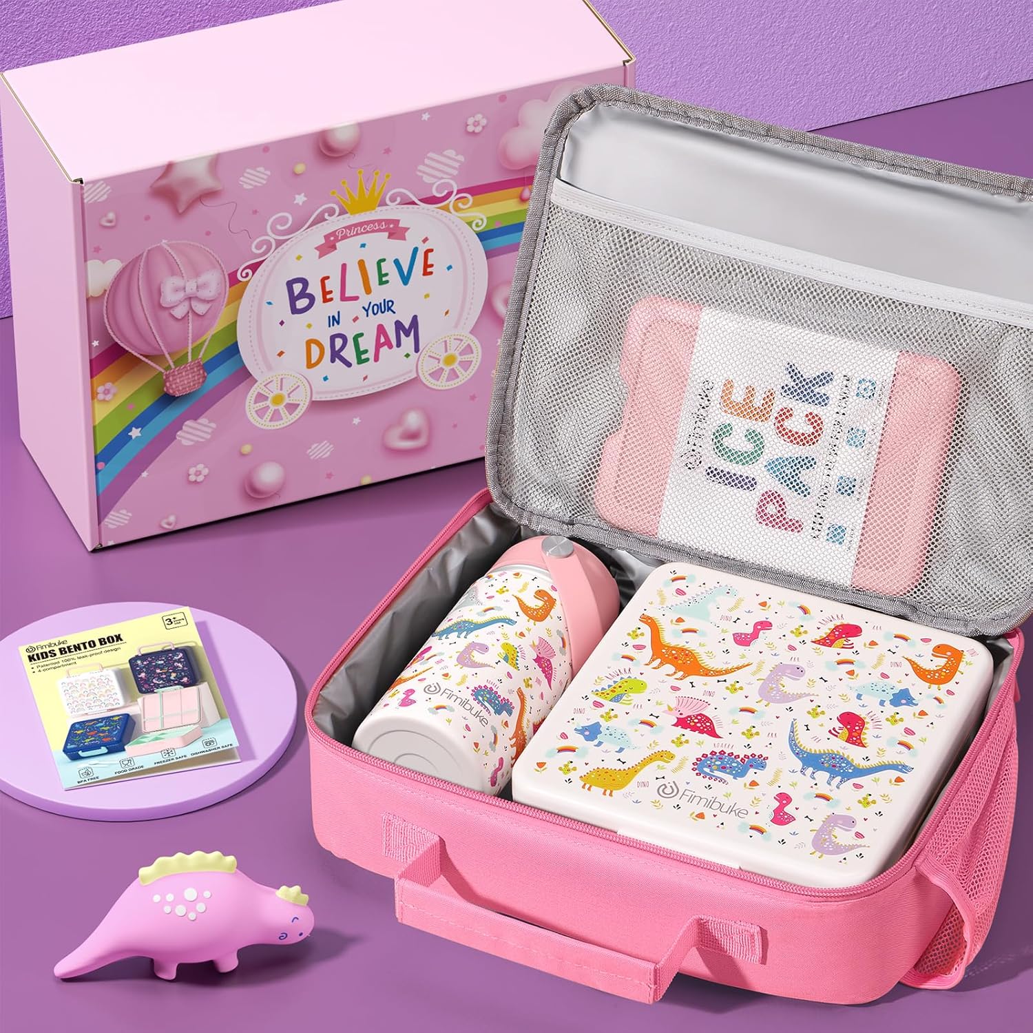 - 7PCS KIDS SCHOOL LUNCH BOX GIFT SET: Fimibuke kids lunch box set provides an one-stop solution for kids school lunch or snacks packing and carrying, this all combined gifts box comes with a 100% leak-proof bento box, a 14oz water bottle insulated, a kids insulated lunch bag, an ice pack, a sauce jar, a set of utensils and an exquisite gift box. Perfect for ages 3-12 kids to daycare, nursery school, preschool, kindergarten, elementary school, back to school or summer camp with a healthy lunch