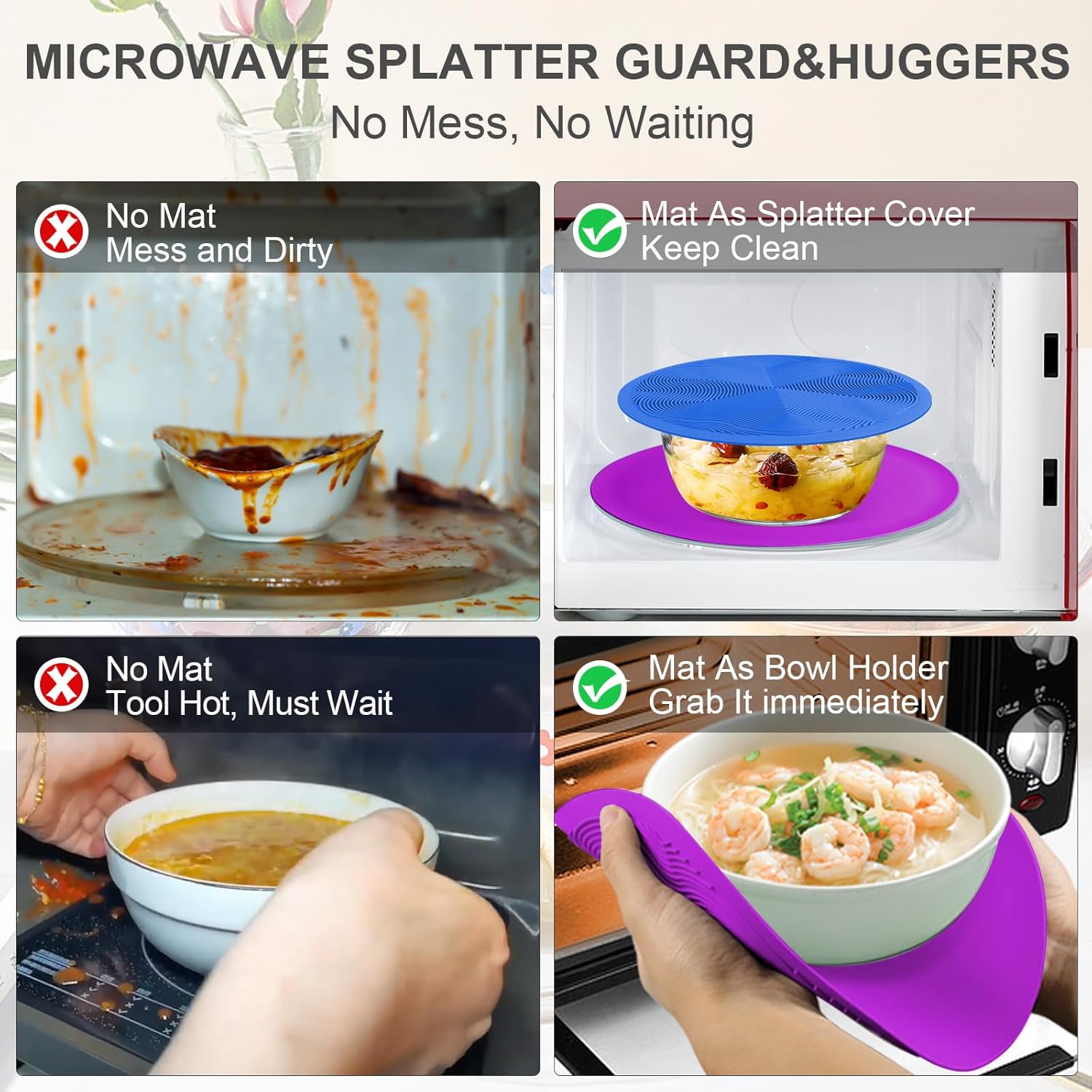 - 【Multi-Purpose】Can be as Microwave Mat, Trivets, Dish Drying Mat, Utensils Rest, Baking Mat, Pot Holder, Table Place Mat, Jar Opener, Coffee Coaster, Splatter Guard, Reusable Lids for Bowls Pots Pans Cups and Food Cover, Pad Heat Protector for Kitchen Counter.