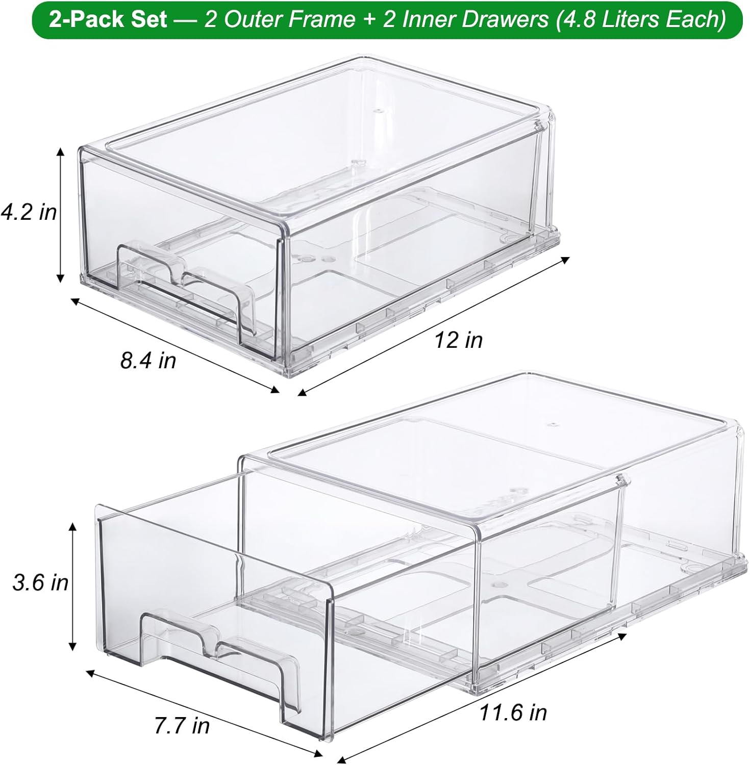 - Ideal Storage Capacity: This set includes 2 outer frames and 2 inner drawers, each providing 5.1-quart capacity to meet various storage needs. Perfect for organizing fresh produce in the fridge or serving as salad bar containers