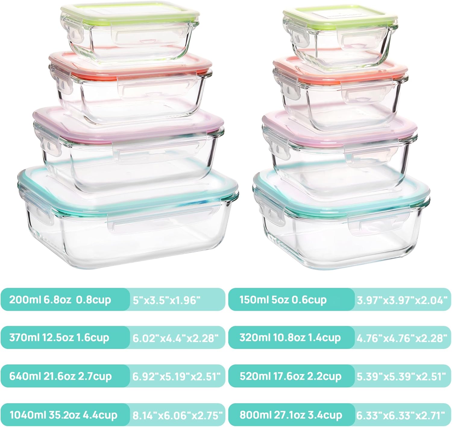 Vtopmart 8 Pack Glass Food Storage Containers with Airtight Lids, Glass Meal Prep Containers, Lunch Containers for Microwave, Oven, Freezer and Dishwasher, BPA Free