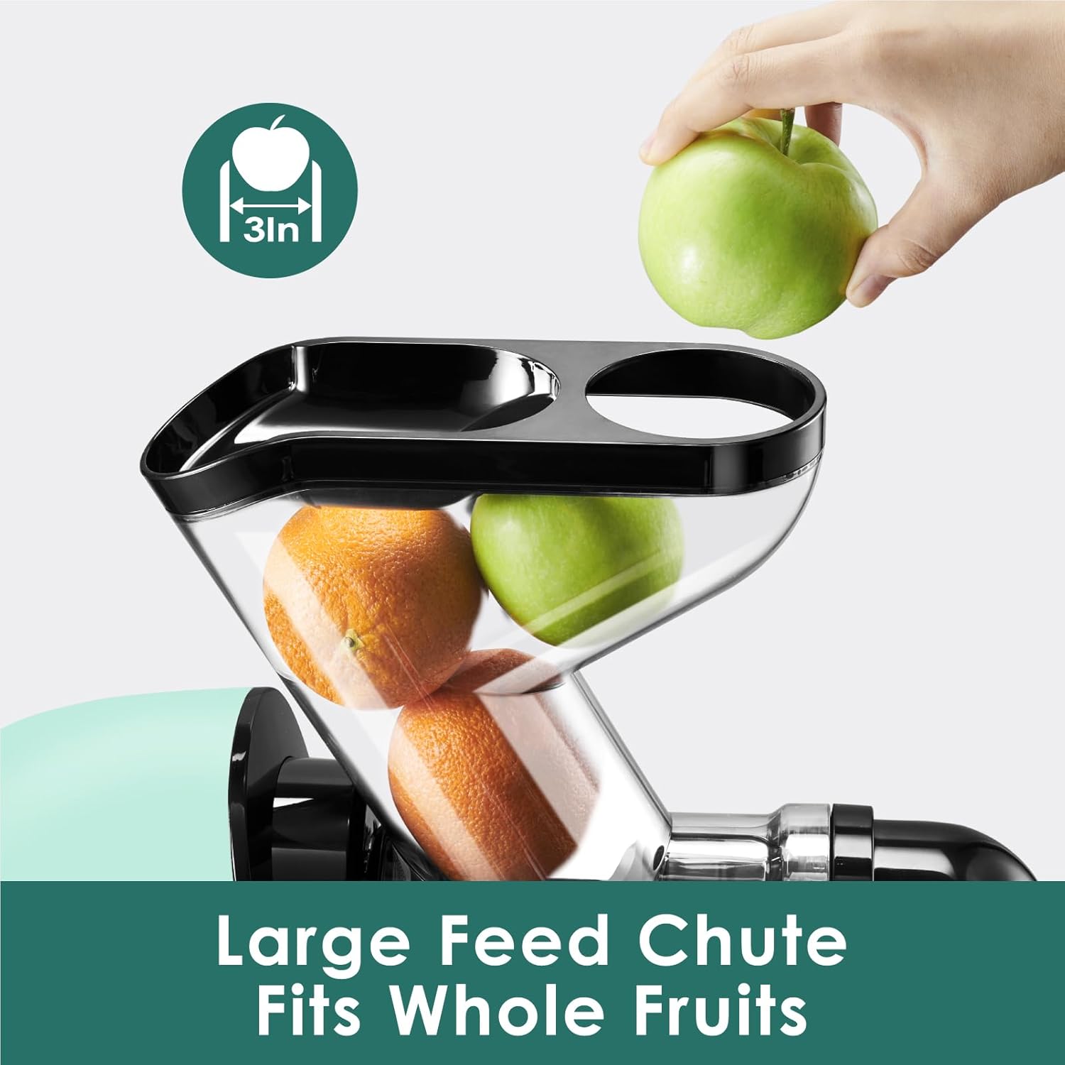 - ăExtra-Wide Feed ChuteăThe Fretta slow masticating juicer is equipped with 3-inch wide feed chute, making it easy to juice large pieces of fruits and vegetables without the hassle of tedious cutting.By minimizing chopping, the juice will be less oxidized, preserving its nutritional content. Tips: This juicer does not automatically remove fruit peels. The image is only for demonstrating the size of the feeding chute. Therefore, for better taste, it is recommended to remove the peels before jucing.
