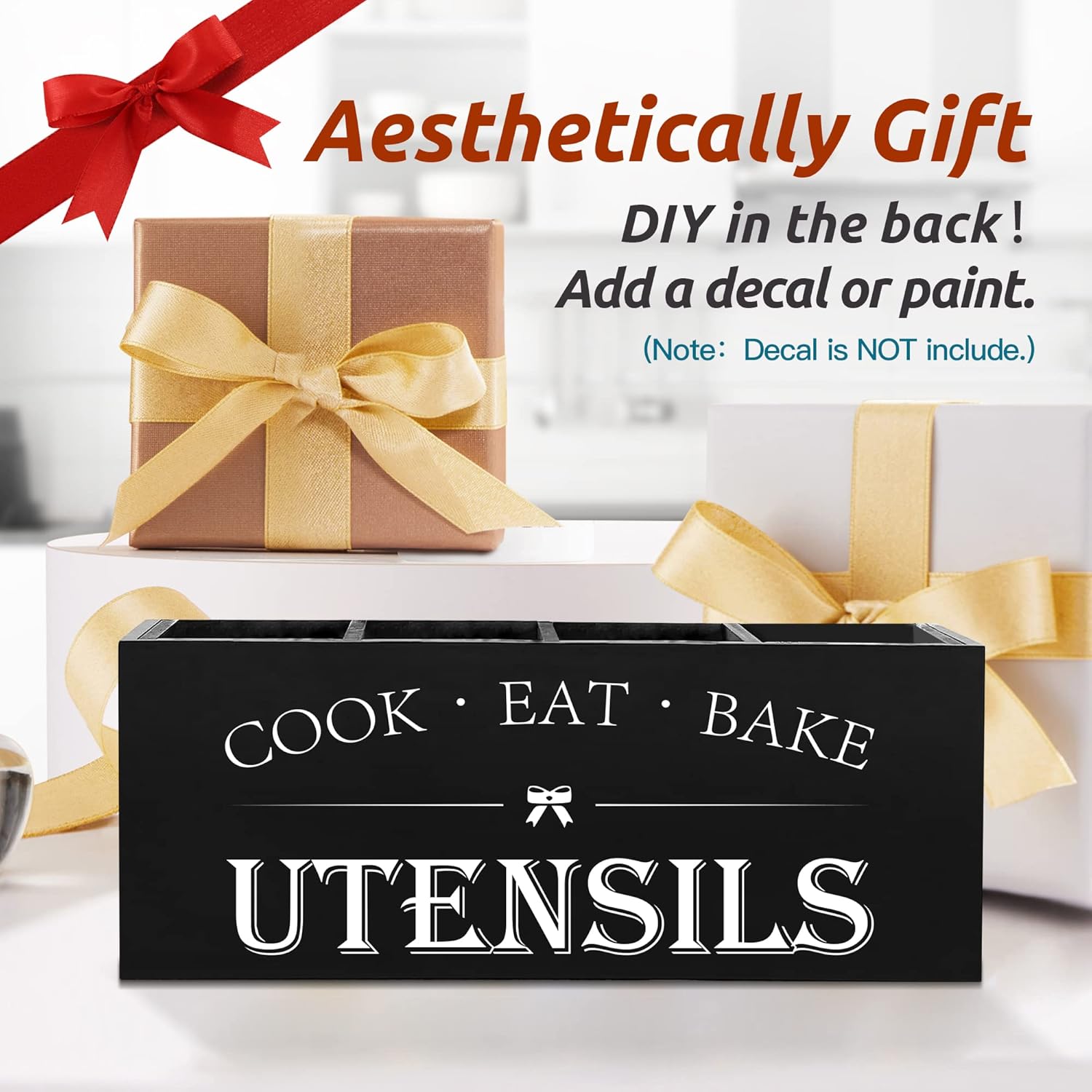 Suli Extra Large Kitchen Utensils Holder with 4 Compartments, Wooden Utensil Organizer for Kitchen Countertop, Farmhouse Kitchen Decor, Rustic Cooking Utensil - Black