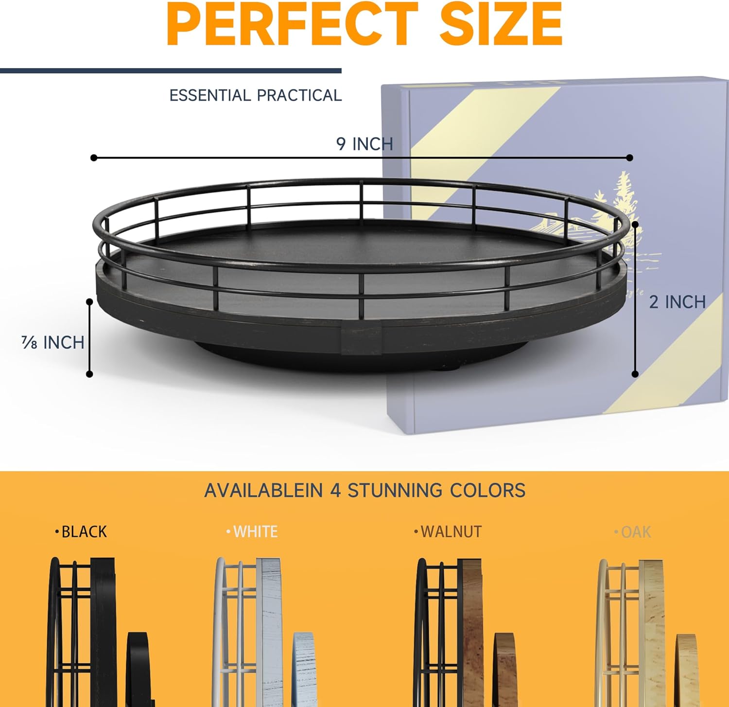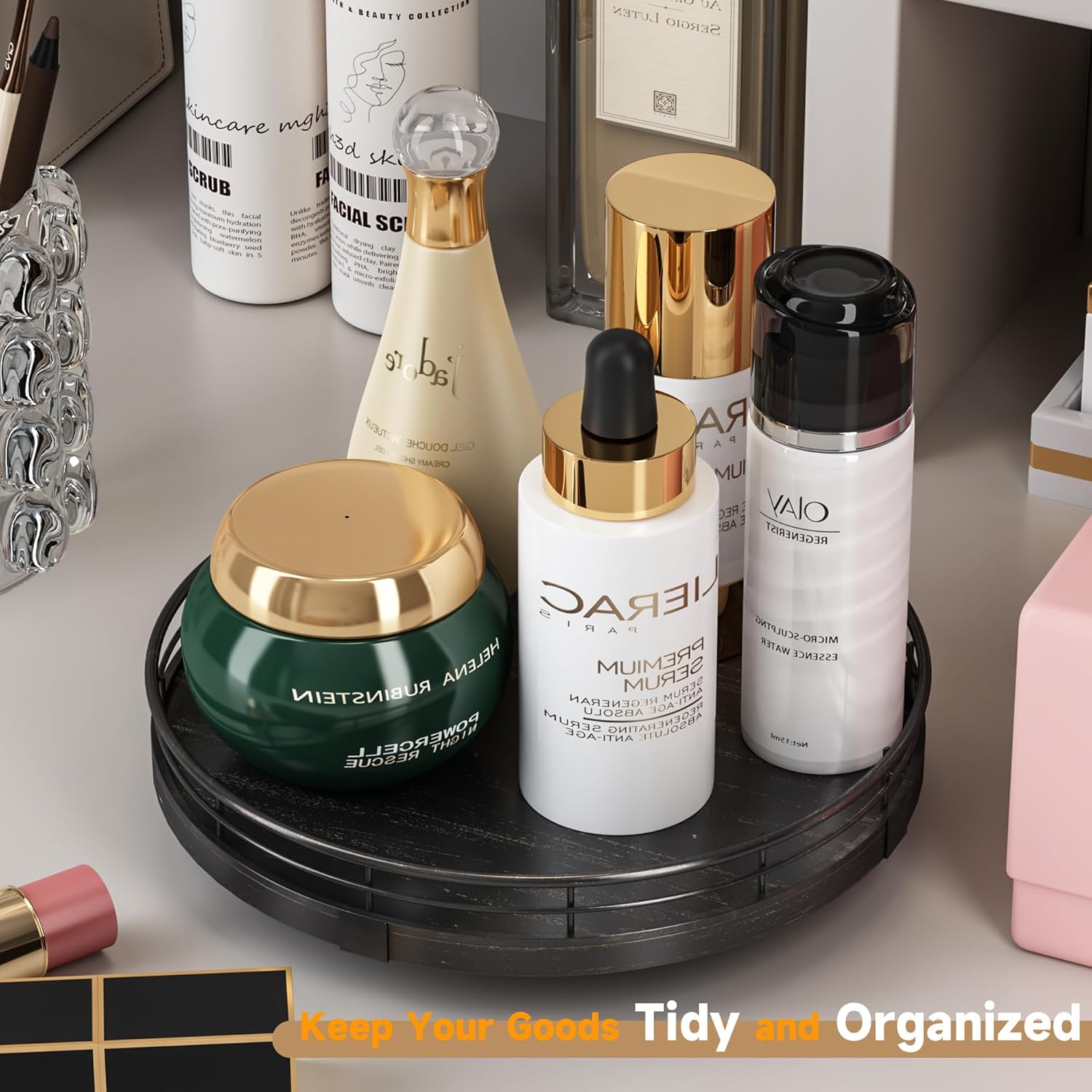 9" Oak Bathroom Vanity Tray Turntable for Perfume Candle, Round Wooden Decorative Tray for Kitchen Sink Countertop Organizer, Bathroom Counter Organizer for Skincare Makeup, Farmhouse Black Gold