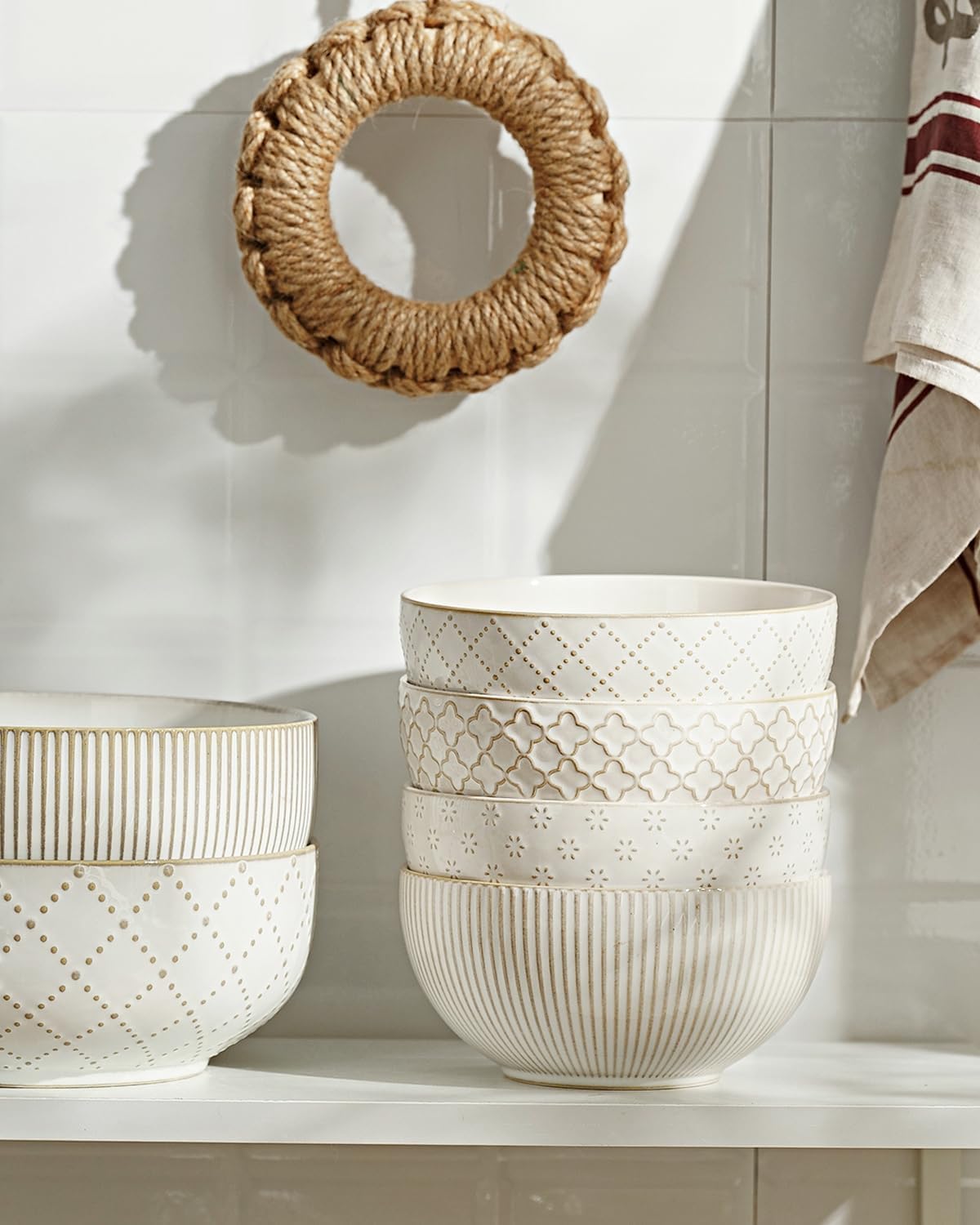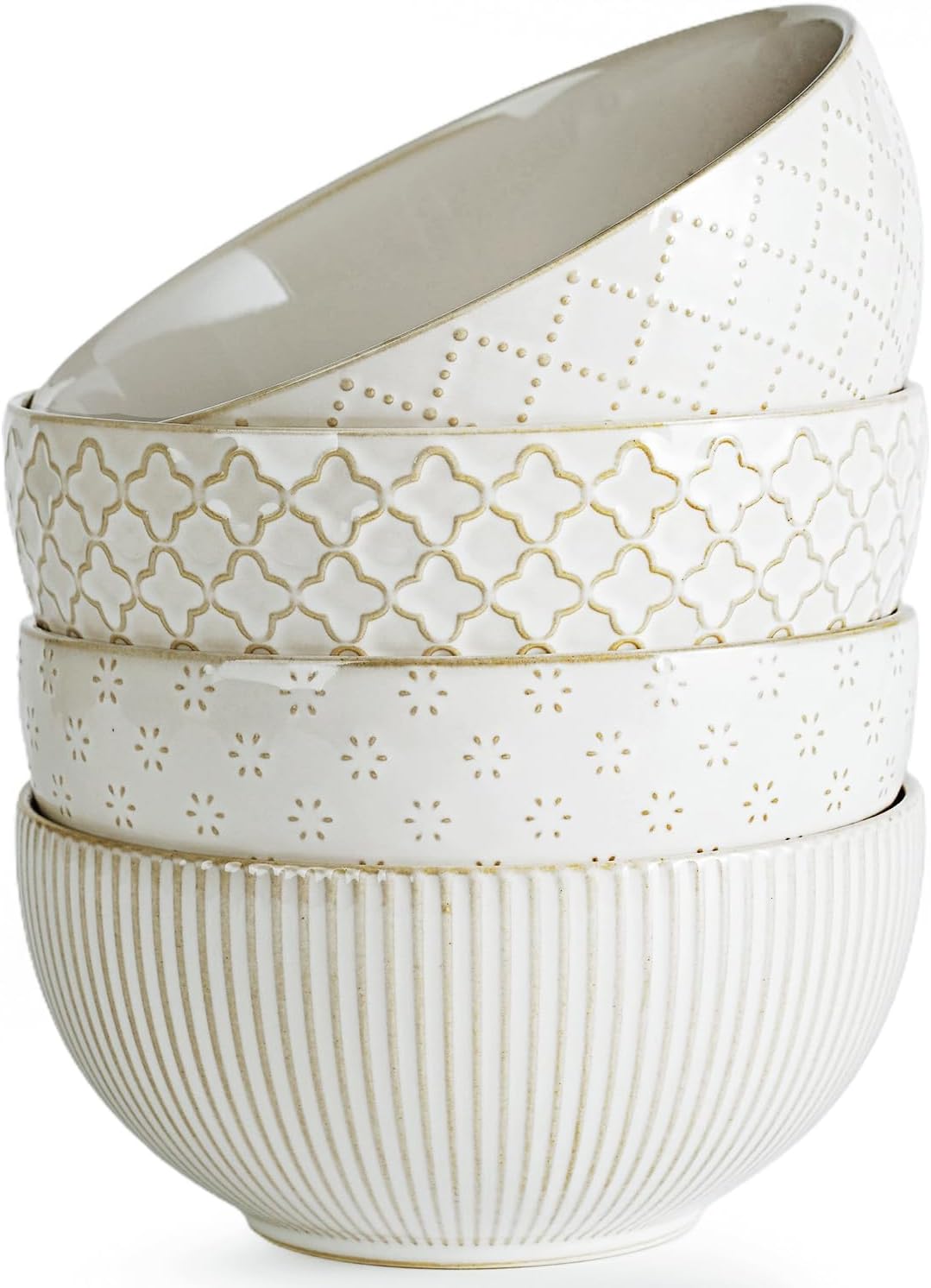 - 【Durable Stoneware】Made of premium ceramic, crafted with a farmhouse decor finish, embossed with 4 different patterns, this aesthetically-pleasing ceramic bowls set offer scratch resistance and durability, ensuring long-lasting use