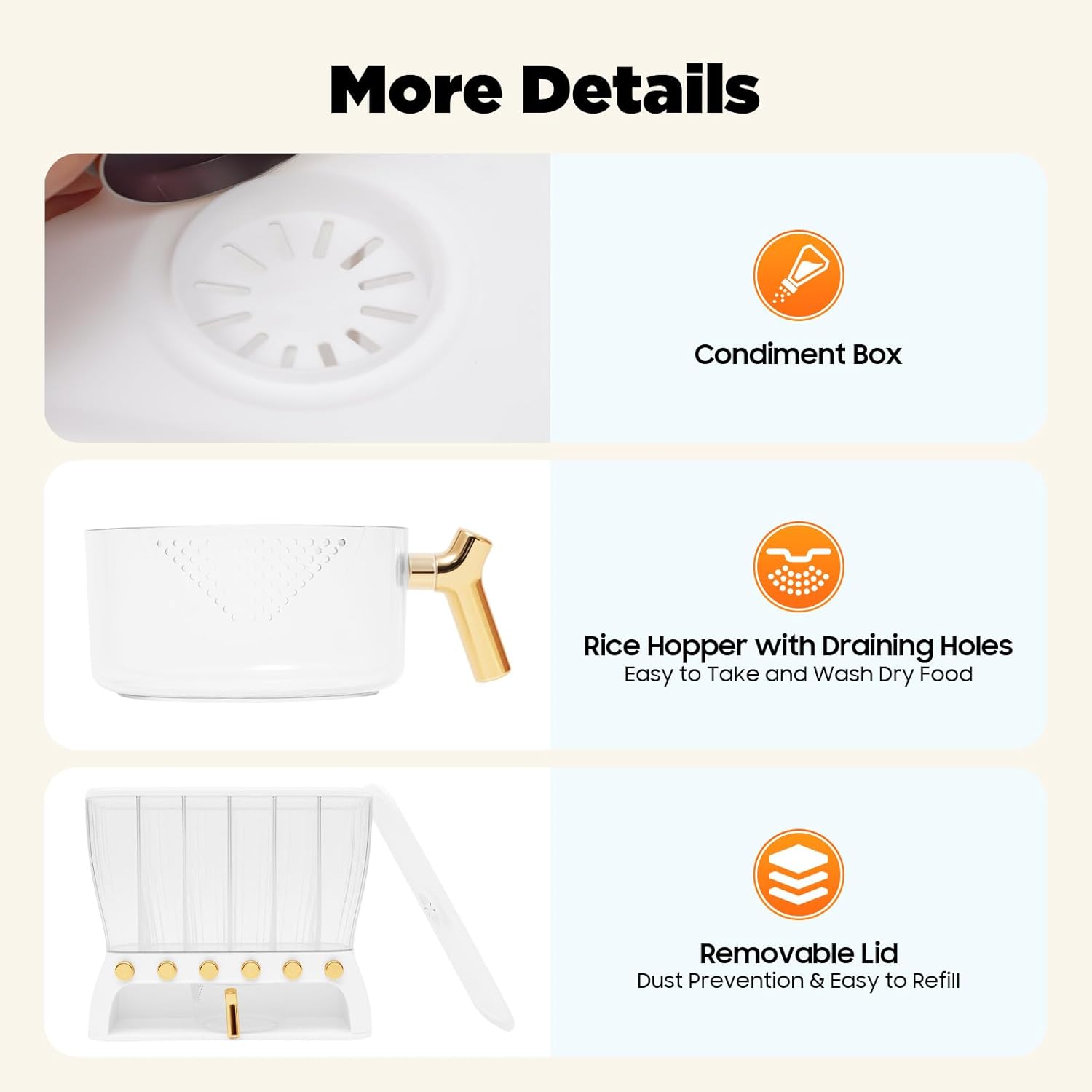 - 【Nice Appearance】 The white and clear combination with the plating process makes this dry food dispenser fit in any corner of your home. When you put colorful dry food inside, it can also add a beautiful decorative effect to your home.