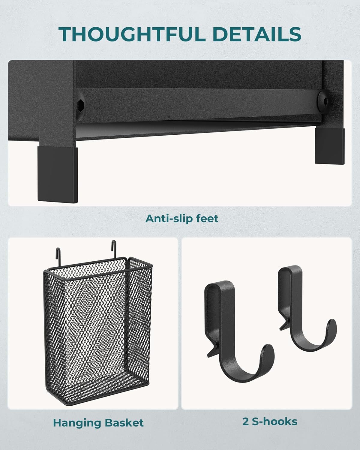 - Stable and Durable Build: This rack is crafted from high-quality metal for long-lasting durability,with super stability to hold your seasoning bottles, makeup items, mugs or coffee bar accessories.The rubber feet on the bottom can prevent the rack from sliding and protect your countertop from scratches.