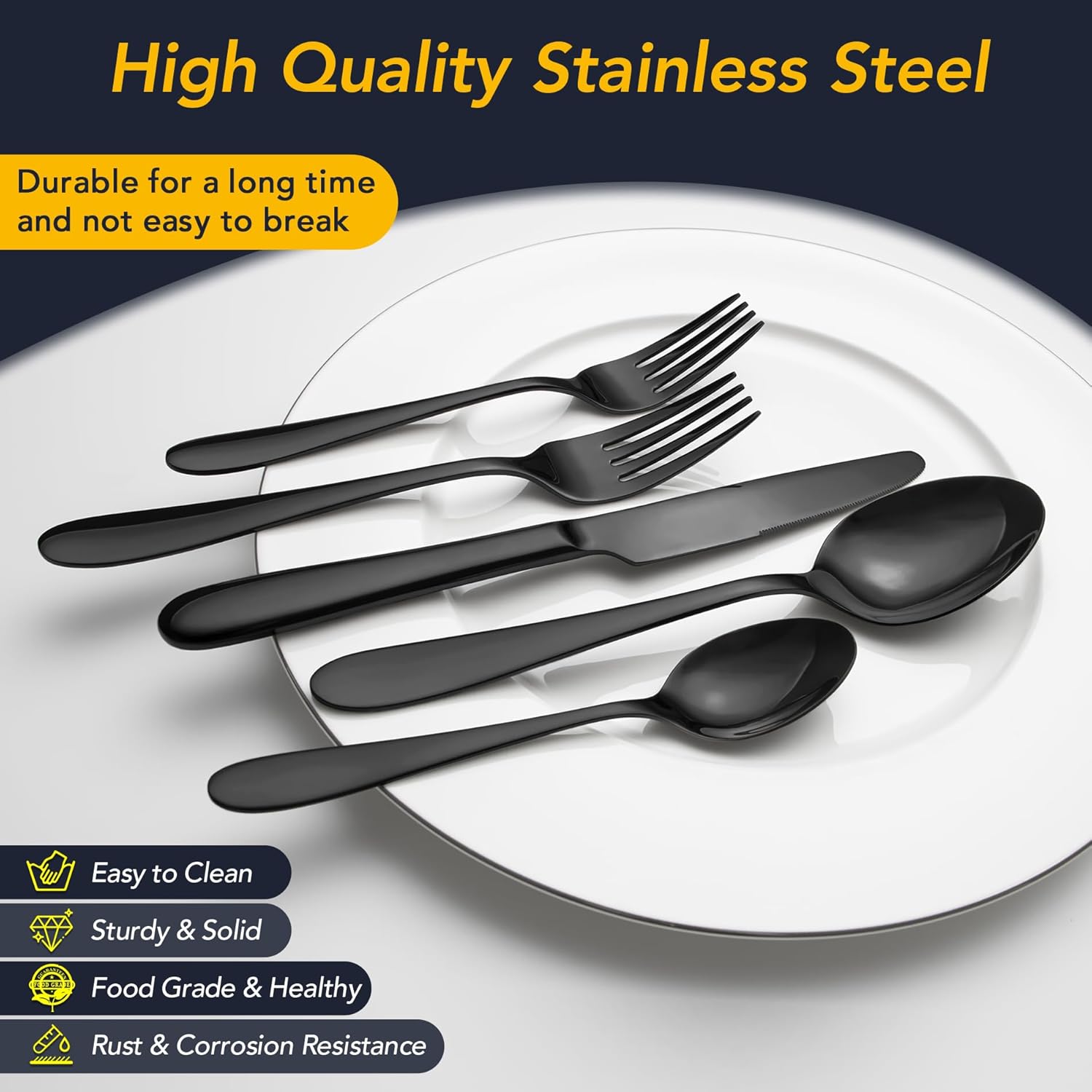 - 【Unique Mirror Black Flatware Set】This black utensil set has a classic silhouette with clean lines and mirrors polished surface in all black standing out from the ordinary silverware, creating elegant and mysterious dining scenes. Each utensil has a medium weight that we think most people will find comfortable. There is no need to worry about fading or cracking, as this is a metal layer from vacuum plating technology. If you want to be different in tableware, you won’t miss it