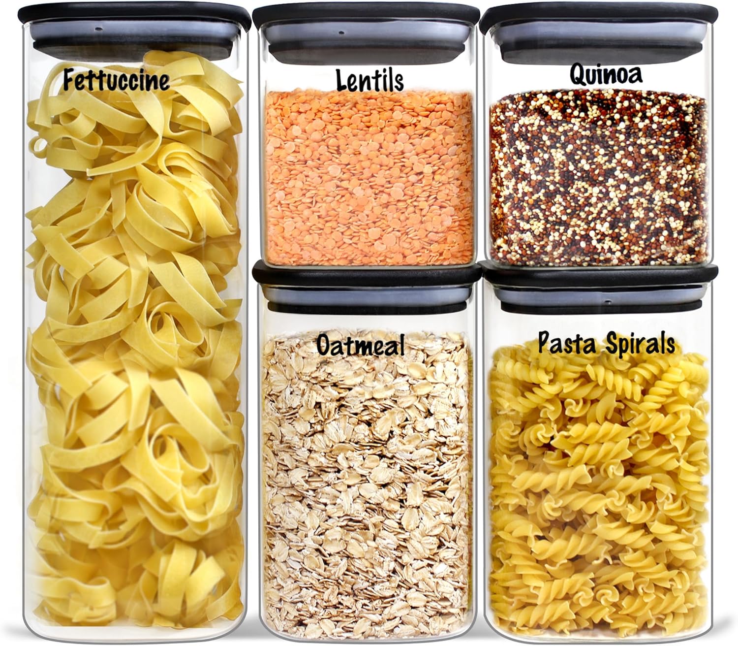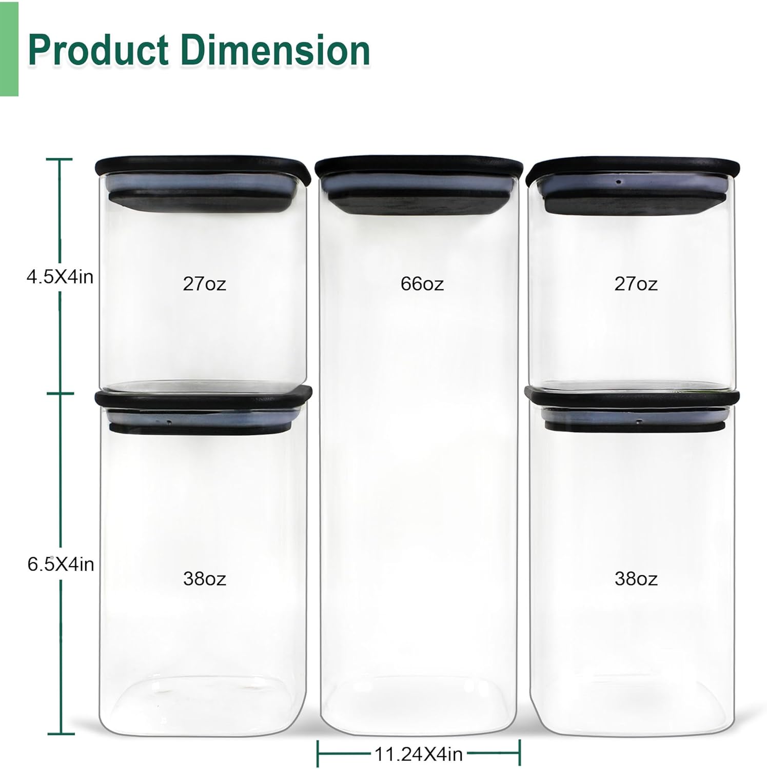 - โ NEW STYLISH BLACK LID SQUARE SHAPE: Looking for black and white, cool and stylish home deco? These Urban Green glass food storage canister sets with black lids are perfect for contemporary pantry design. We carefully selected 5 different sizes from 6oz to 100oz that can store any dry food, such as pasta, beans, nuts, cookies, spice or flour. Try our black lids glass jars for a new modern pantry organization.