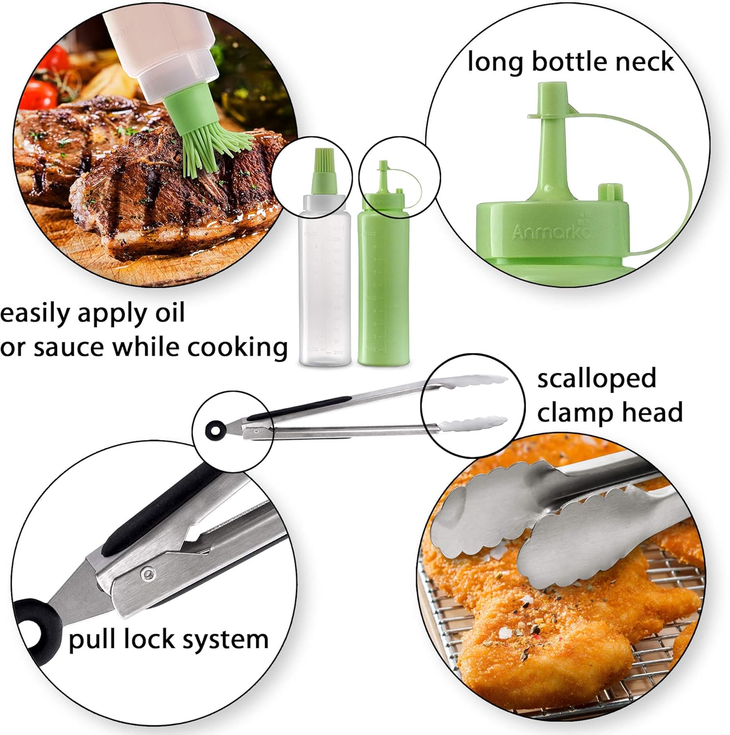 - ā PROFESSIONAL STAINLESS STEEL SPATULA SET - includes 1 x cooking spatula turner, 1 x grill spatula, 1 x grill tongs, 2 x squeeze bottles with silicone brush lid.