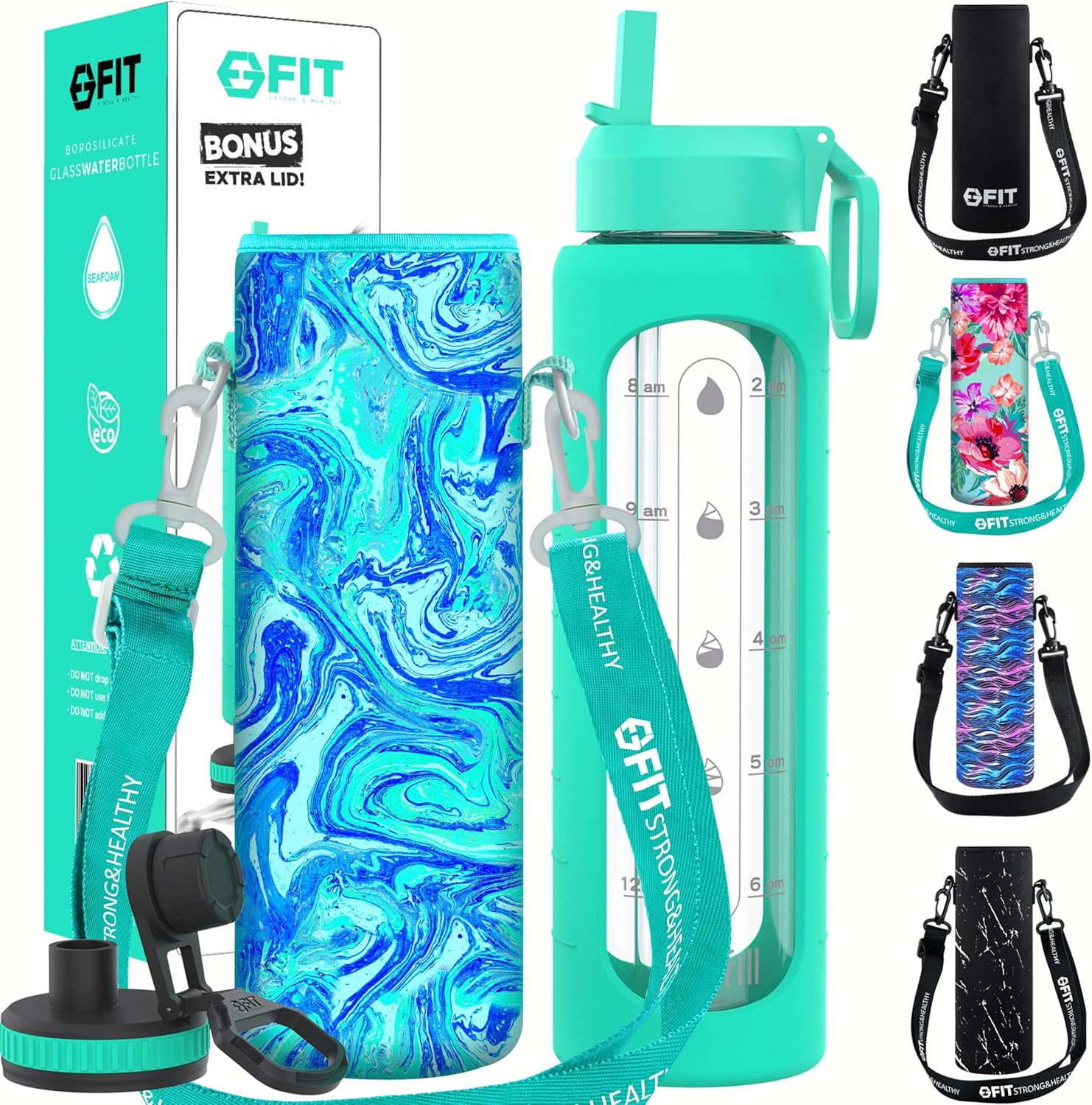 - Ultimate Hydration Set for Hands-free Experience: Upgrade your hydration routine with our 32 oz glass water bottle with time marker and water bottle holder with a shoulder strap set; the water bottle is made of borosilicate glass and has a thick glass bottom for added durability; it comes with an extra-thick silicone sleeve for added protection and a secure grip; enjoy the convenience of an extra lid; this set also includes a neoprene water bottle holder with strap for convenient carrying