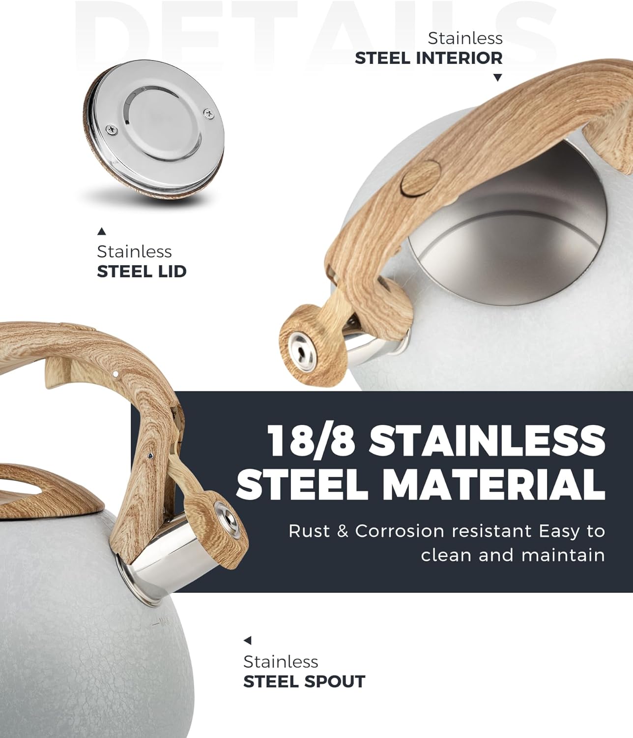 - Fast Heat Base: The tea kettle designed with a generous 8 in base can maximize the heat conduction to increase the efficiency of boiling. High grade stainless steel is suitable for any heat source including gas, electric and induction.