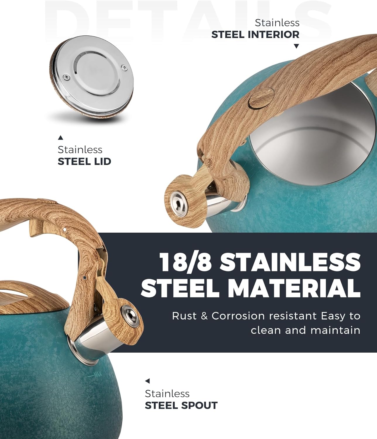- Fast Heat Base: The tea kettle designed with a generous 8 in base can maximize the heat conduction to increase the efficiency of boiling. High grade stainless steel is suitable for any heat source including gas, electric and induction.