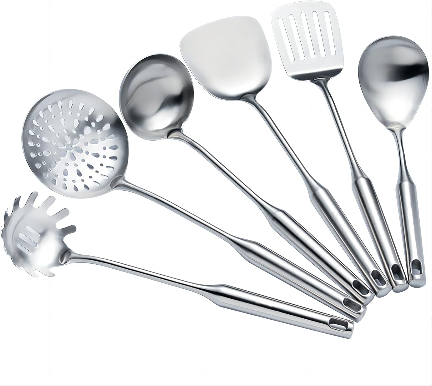 - 🌿Versatile 6-Piece Set: This kitchen utensil set comprises six essential cooking tools, including a wok spatula, soup ladle, skimmer slotted spoon, spaghetti spoon, serving spoon, and slotted spatula turner. From stir-frying to serving, saucing to scooping, you'll have the perfect tool for every culinary task.