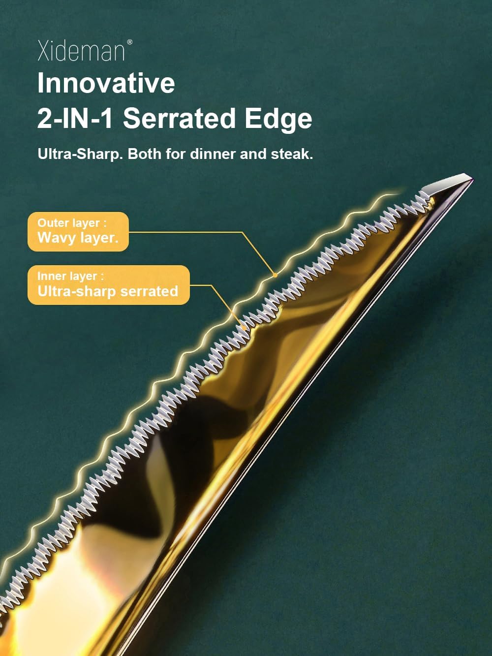 - Included Components : 4 ultra-sharp 2-in-1 serrated knives, 4 dinner fork, 4 dinner spoon, 4 coffee Spoons / mini teaspoons 4 ultra-sharp 2-in-1 serrated knives, 4 dinner fork, 4 dinner spoon, 4 coffee Spoons / mini teaspoons