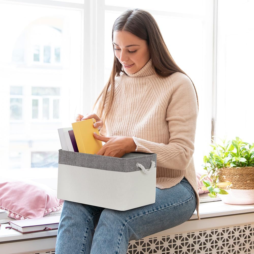 Organization and Storage Bins for Shelves - Large 4 Pack 16x12x8 inch Collapsible Storage Basket for Organizing, Fabric Storage Cubes for Box Closet Cloth Toy Nursery Books Kids (Grey & White)