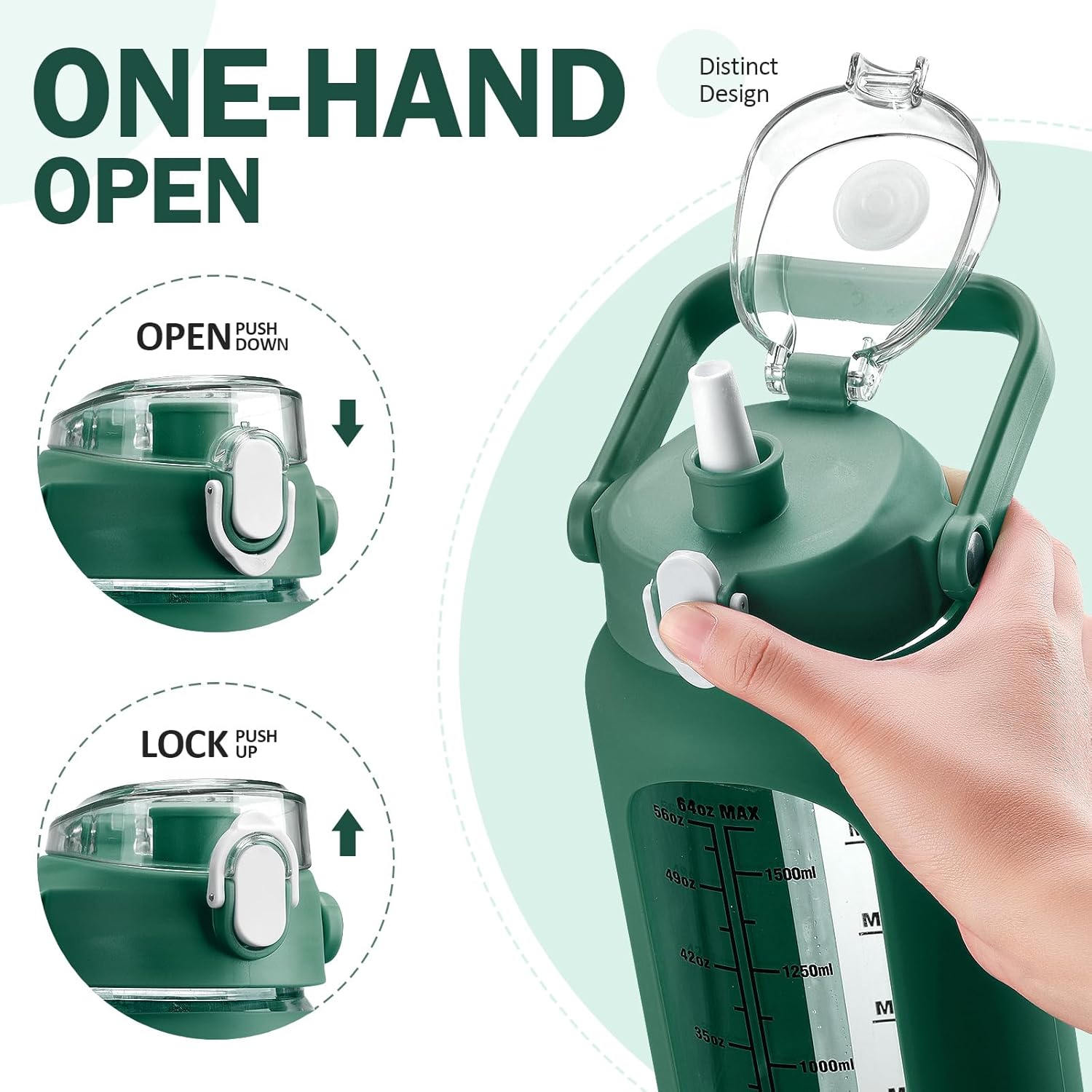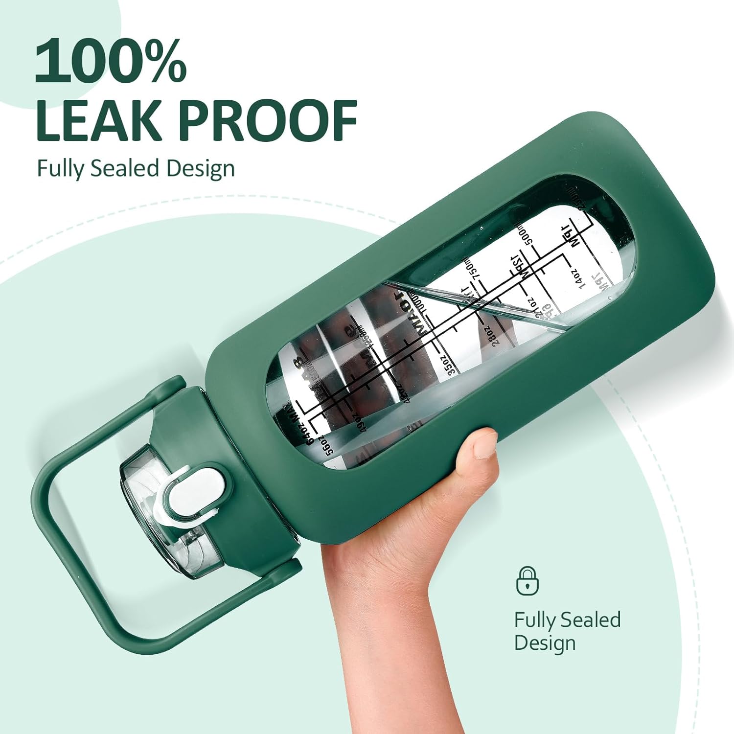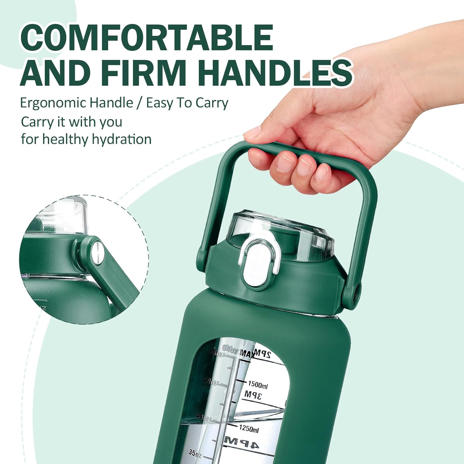 kytffu 64oz Glass Water Bottles with Straw, Half Gallon Motivational Glass Bottle with Silicone Sleeve and Time Marker, 2L Leakproof Large Glass Water Jug for Gym Home Office, Ink Green