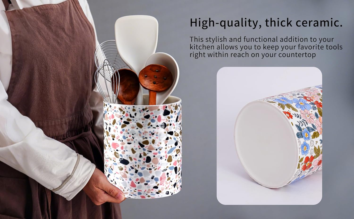 - Stable and Fall-Prevention. Unlike common metal or stainless steel utensil holders, this marble print round shape ceramic kitchen utensil holder is heavy and stable, avoiding utensils from falling and spilling all over the kitchen.