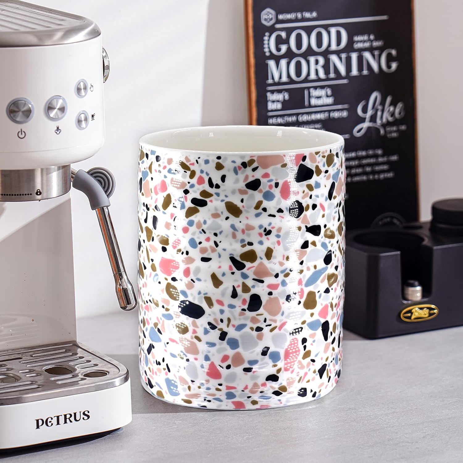 - feature unique terrazzo marble pattern design for enjoyable kitchen time. Remarkable display can be a charming decoration even an artwork in your dining table and kitchen.
