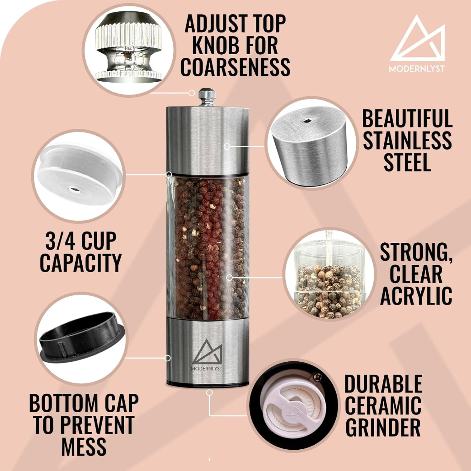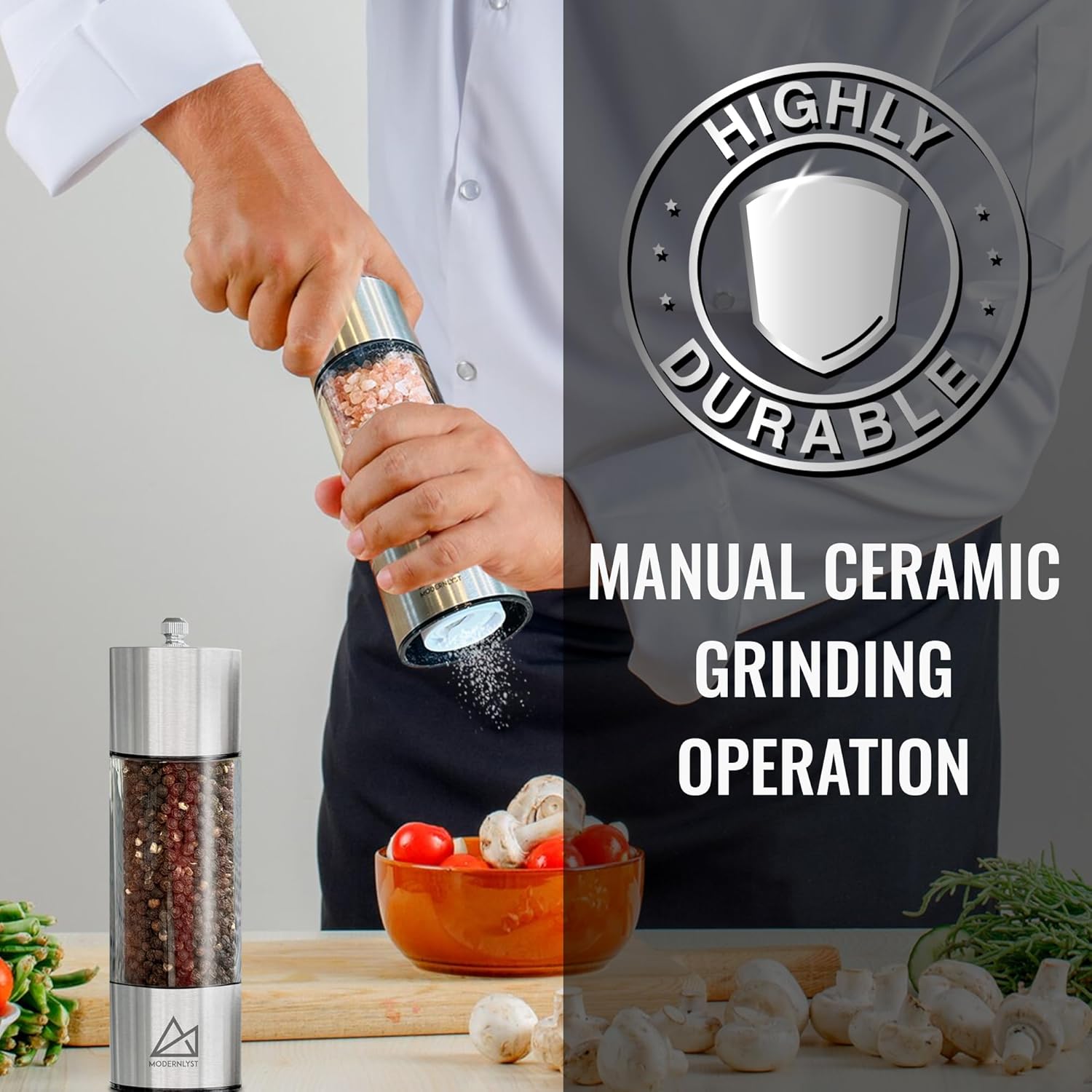 - ENSURED LONGEVITY - Our salt and pepper mill set features the best corrosion-resistant ceramic grinder for a smooth grind and high performance. The stainless steel and heavy duty acrylic body are sleek and sturdy to ensure increased longevity.
