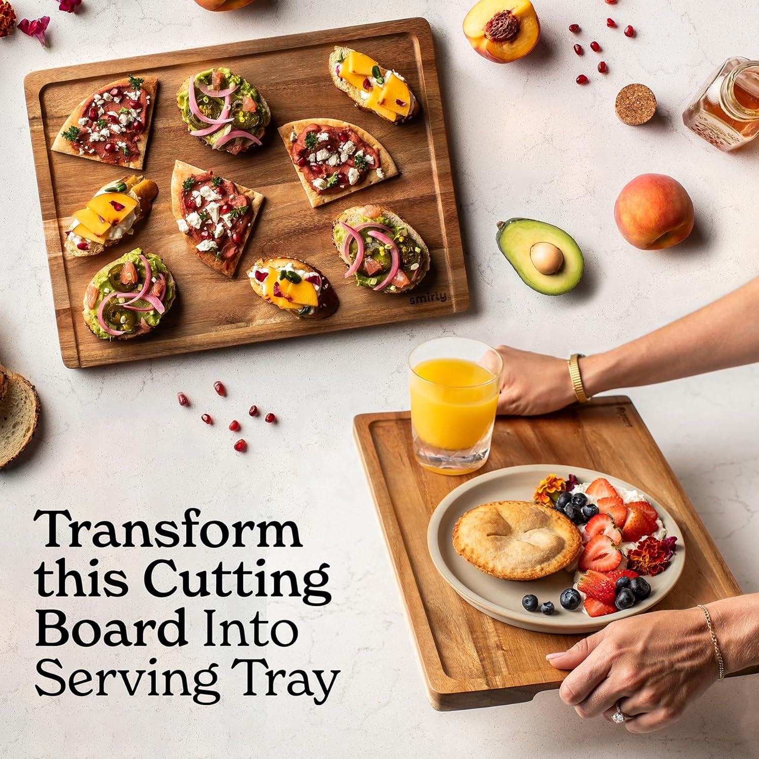 - Add Simplicity and Convenience - Our cutting boards for kitchen save you time and add functionality. Smirly’s Acacia cutting boards feature non-slip feet, easy-grip handles, and juice grooves. These durable wooden cutting boards are built to last.