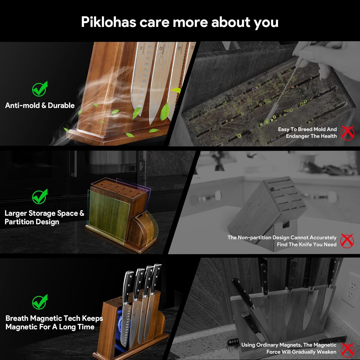 - Space-Saving Design Of Magnet Knife Block: The double-sided magnetic design can easily hold up to 21 pieces of cutting tools, keeping your kitchen countertop clean and organized. The knife holder helps you secure your knives vertically without pushing them into a wooden, hard plastic, or metal block, which helps reduce scratches on the blade and damage to the edge.
