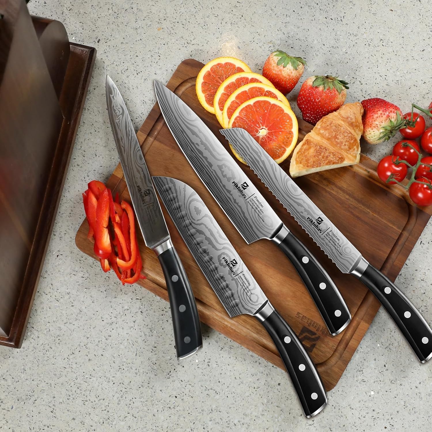 - Enduring & Excellence Sharpness: Professional, the satin-finished blade has precision cutting and is finely honed. Each knife's edge of Piklohas is hand-polished and precisely achieves 15 degrees per side for maximum sharpness, with Rockwell hardness of 58, extraordinary properties, and edge retention.