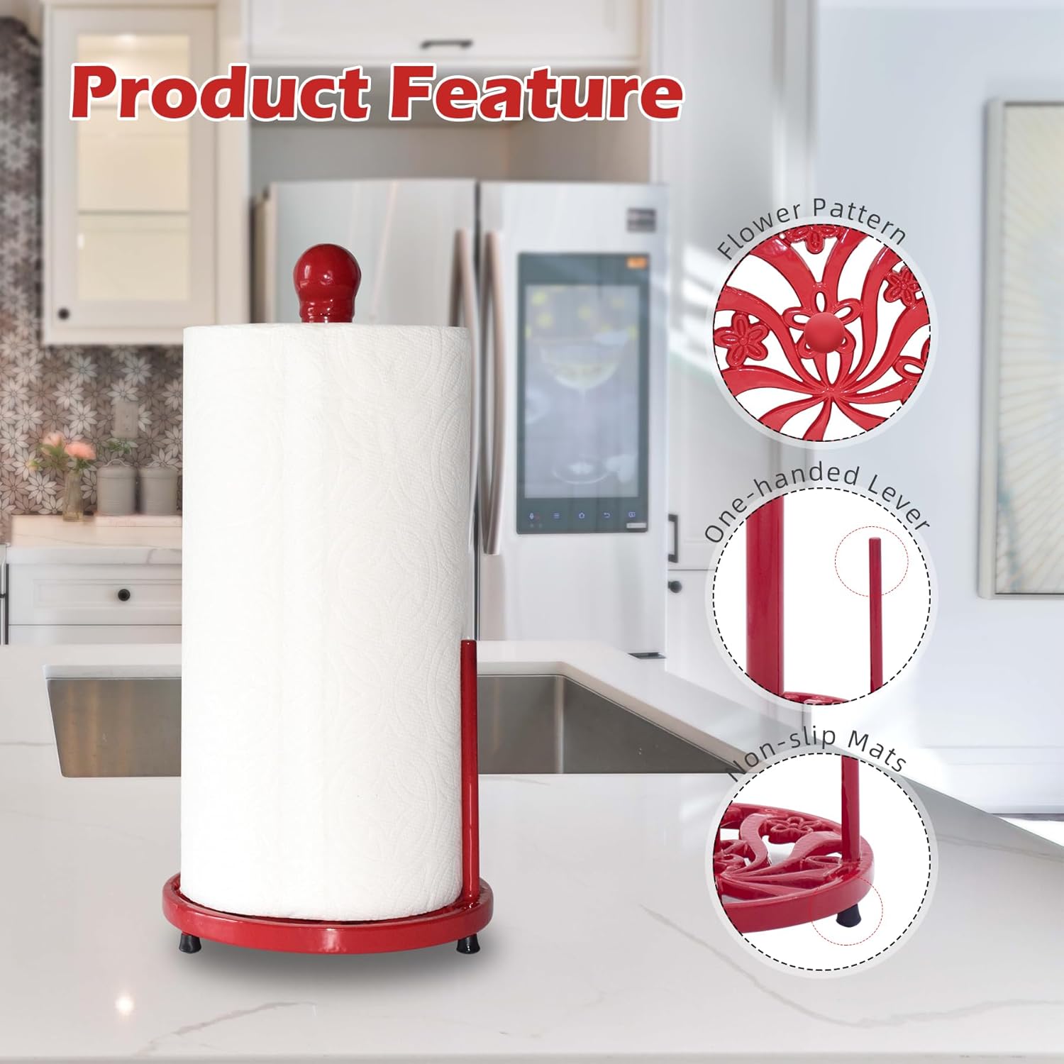 Vintage Paper Towel Holder Countertop - Cast Iron Standing Roll Paper Towel Dispenser with Elegant and Heavy Daffodil Pattern Base for Kitchen Décor, Red