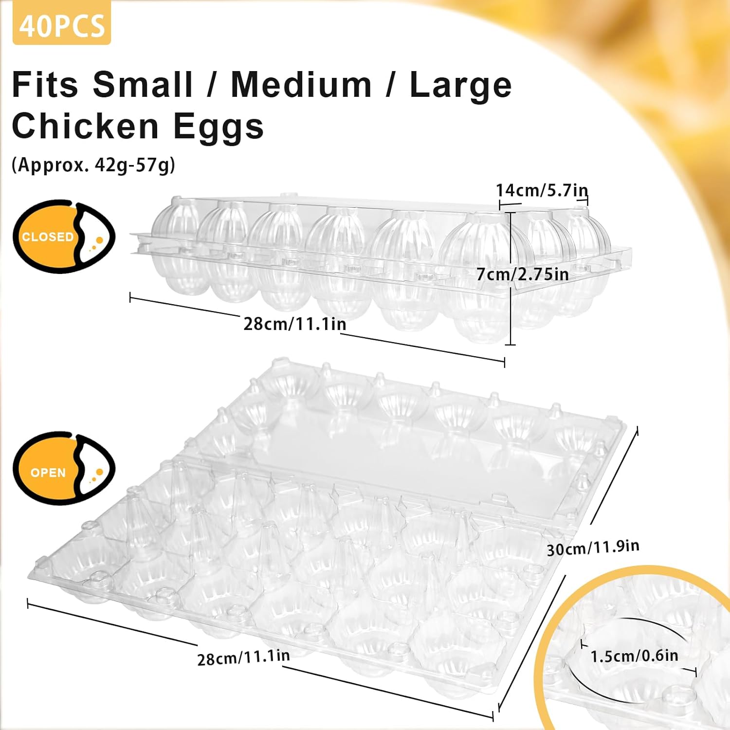 - Dimensions (when closed): 11.1" L x 5.7" W x 2.75" H, 40 Pack 18 count egg cartons. Each egg carton can hold 18 medium sized eggs ( approx. 42g to 57g), but not for duck eggs, goose eggs and jumbo sized eggs