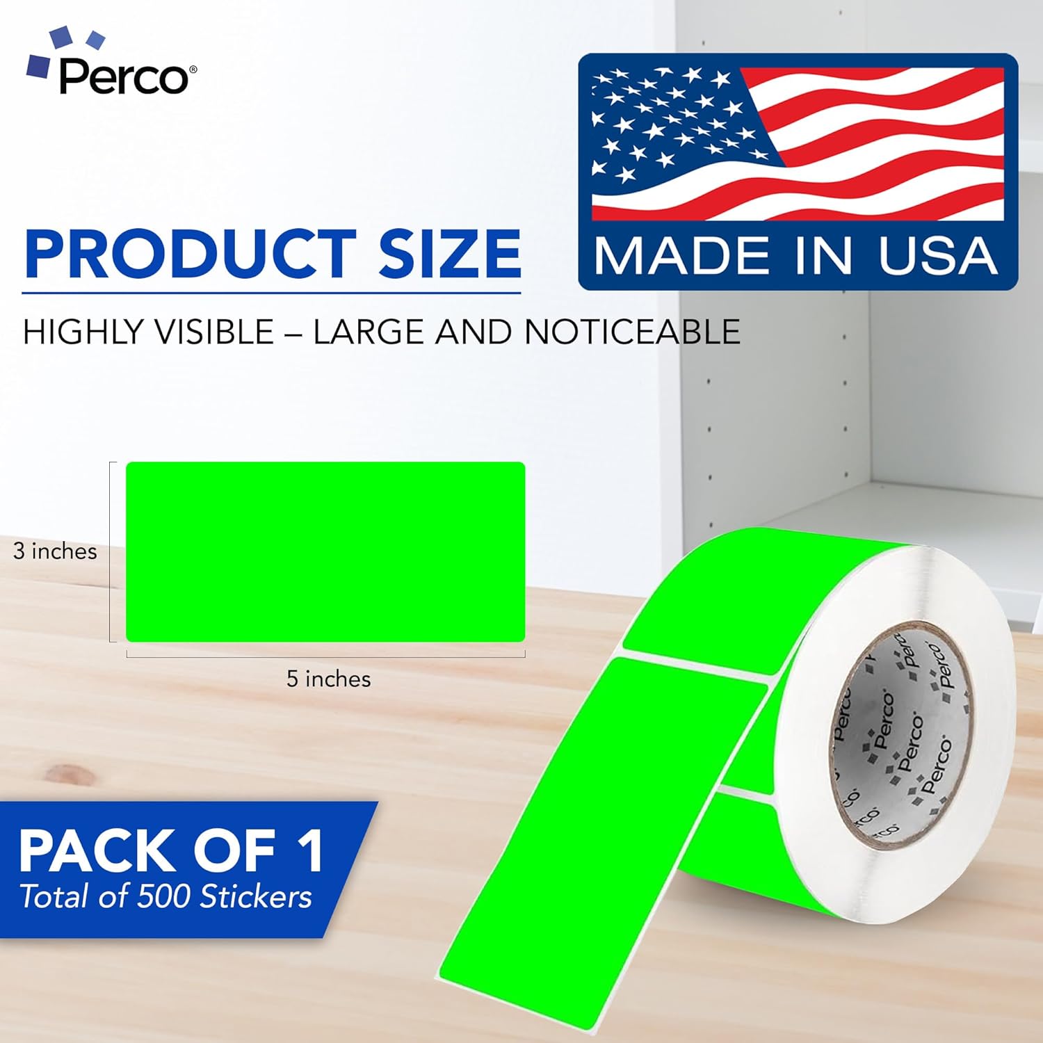 Perco Fluorescent Green Labels 3x5 Inch 500 Stickers/Roll with Easy Peel Perforation and Strong Adhesion for Inventory Management, Color Coding, Moving Boxes, Retail, Organizing & Crafts – Made in USA