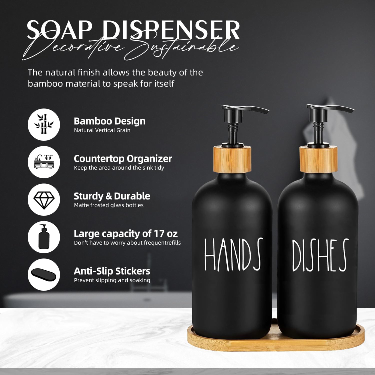 - REFINED SOAP DISPENSER SET - This package includes 2 durable glass bottles and a beautifully crafted artisanal tray. By replacing disposable plastic dispensers, it offers luxurious solution for your kitchen decor