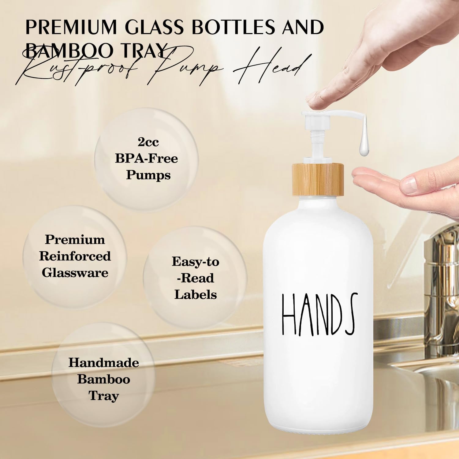 Arktek Glass Soap Dispenser Set with Tray, 2 Pack Hand and Dish Soap Dispenser Set for Bathroom and Kitchen Bottle Dispenser with Dish Soap, Hand Soap, Lotion 17 Oz (2 White)