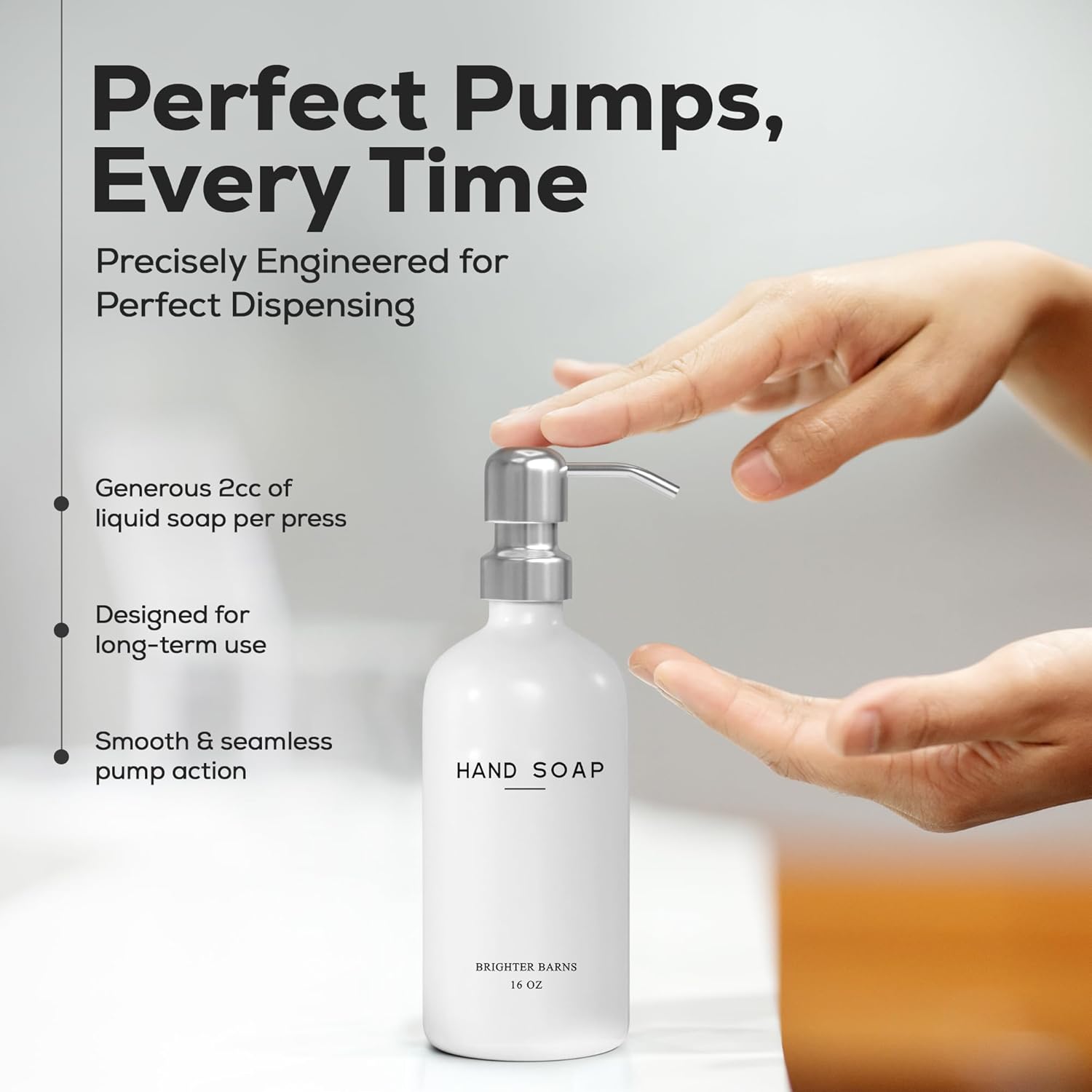 - AMERICAN DESIGN, UNCOMPROMISING QUALITY - Crafted with meticulous attention to detail, our glass soap dispenser set features 2 fortified 16oz glass bottles along with a set of corrosion-proof 304G stainless steel silver pumps. All designed in the USA to provide unbeatable quality and enduring style that you can trust.