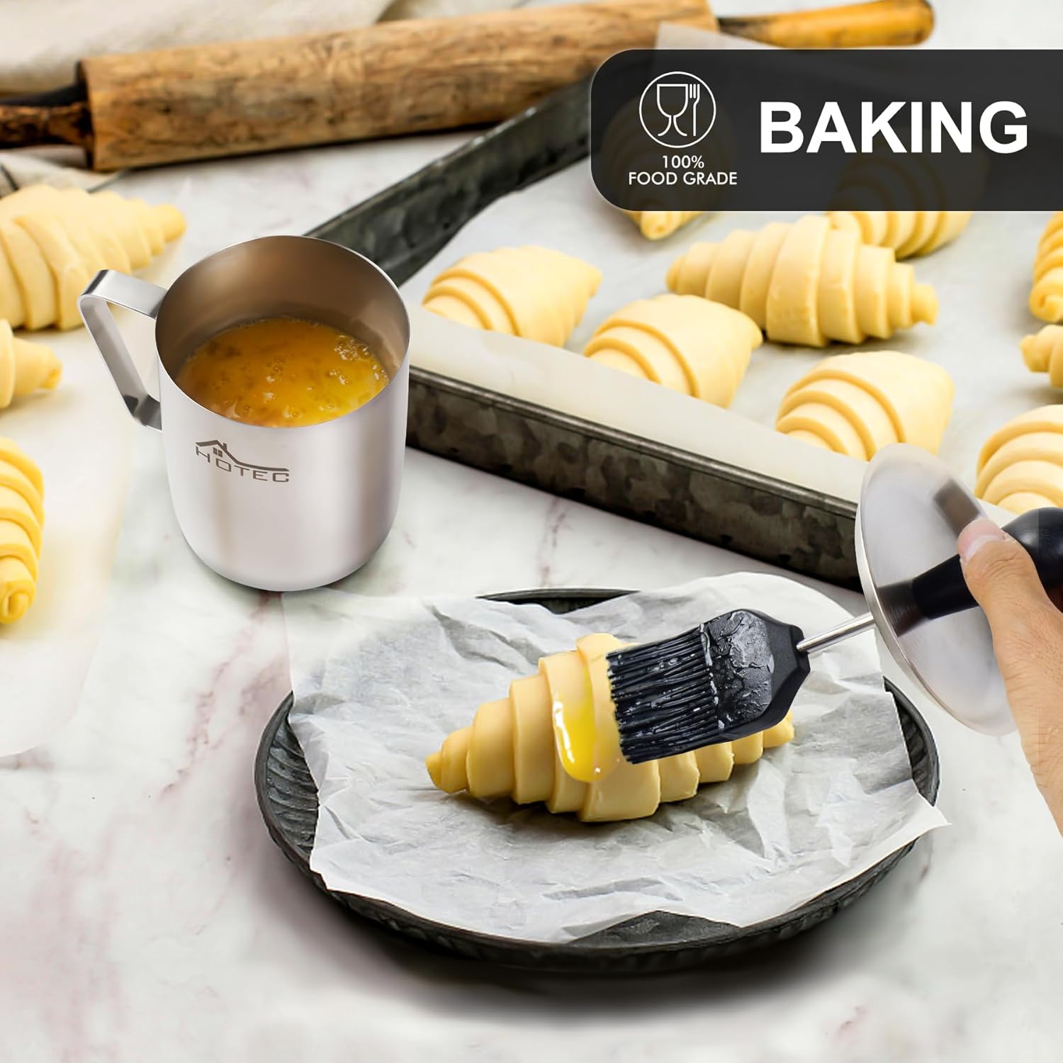 HOTEC Stainless Steel 304 Basting Pot with Brush, Silicone Grill Barbeque Basting Brushes for Sauce Oil, 36oz