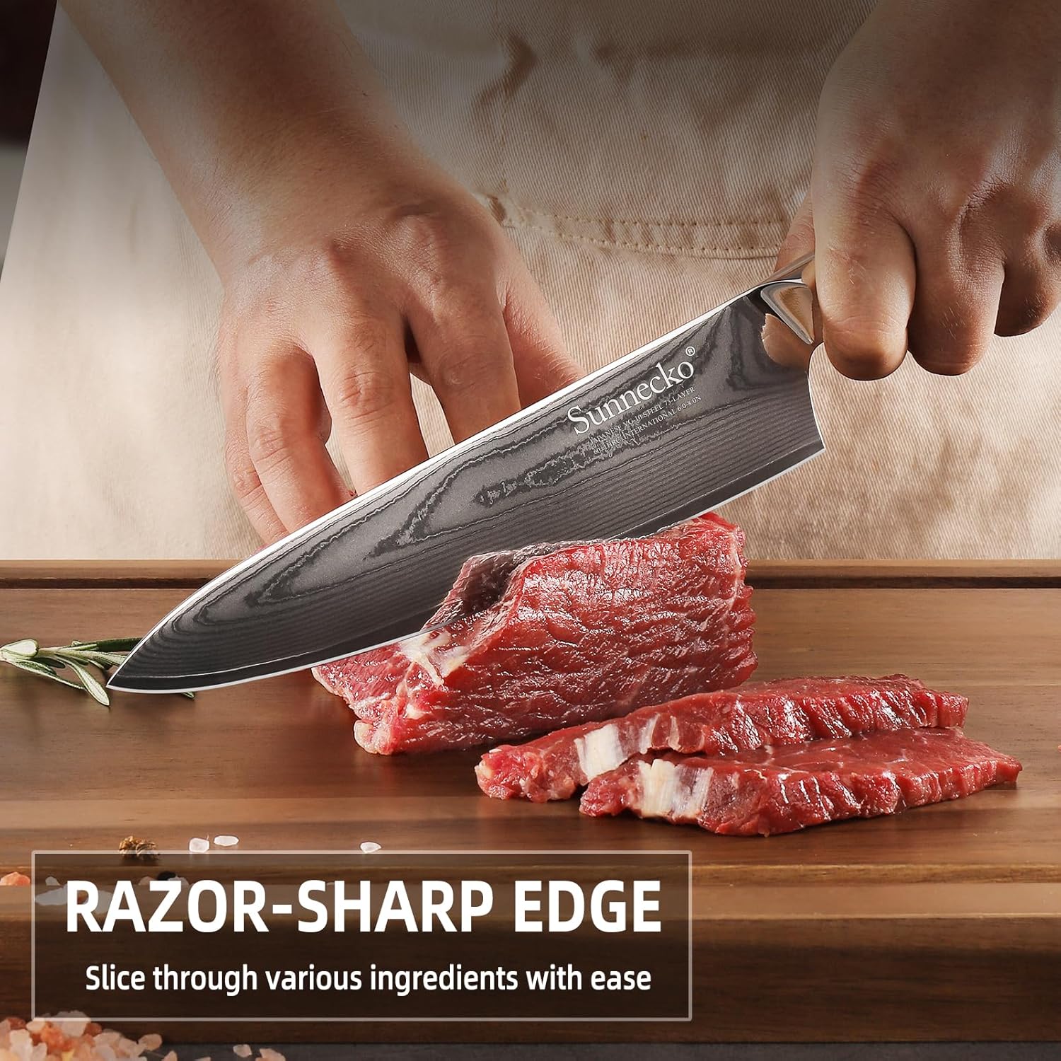 - Unmatched Sharpness: Designed for precision, ultra sharp cooking knife slice through various ingredients with ease. Whether you’re cutting meats, dicing vegetables or filleting fish, the razor sharp chef knife set ensures clean and precise cuts every time, making food prep effortless.