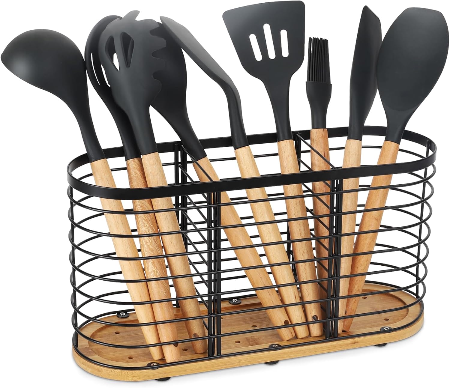 Utensil holder for Kitchen Counter- Large Utensils Holder For Farmhouse Cooking 13.5" x 4.3" x 6.9" with Wooden Base Matte Black Cooking Utensil Holder Spatula Holder Utensil Caddy