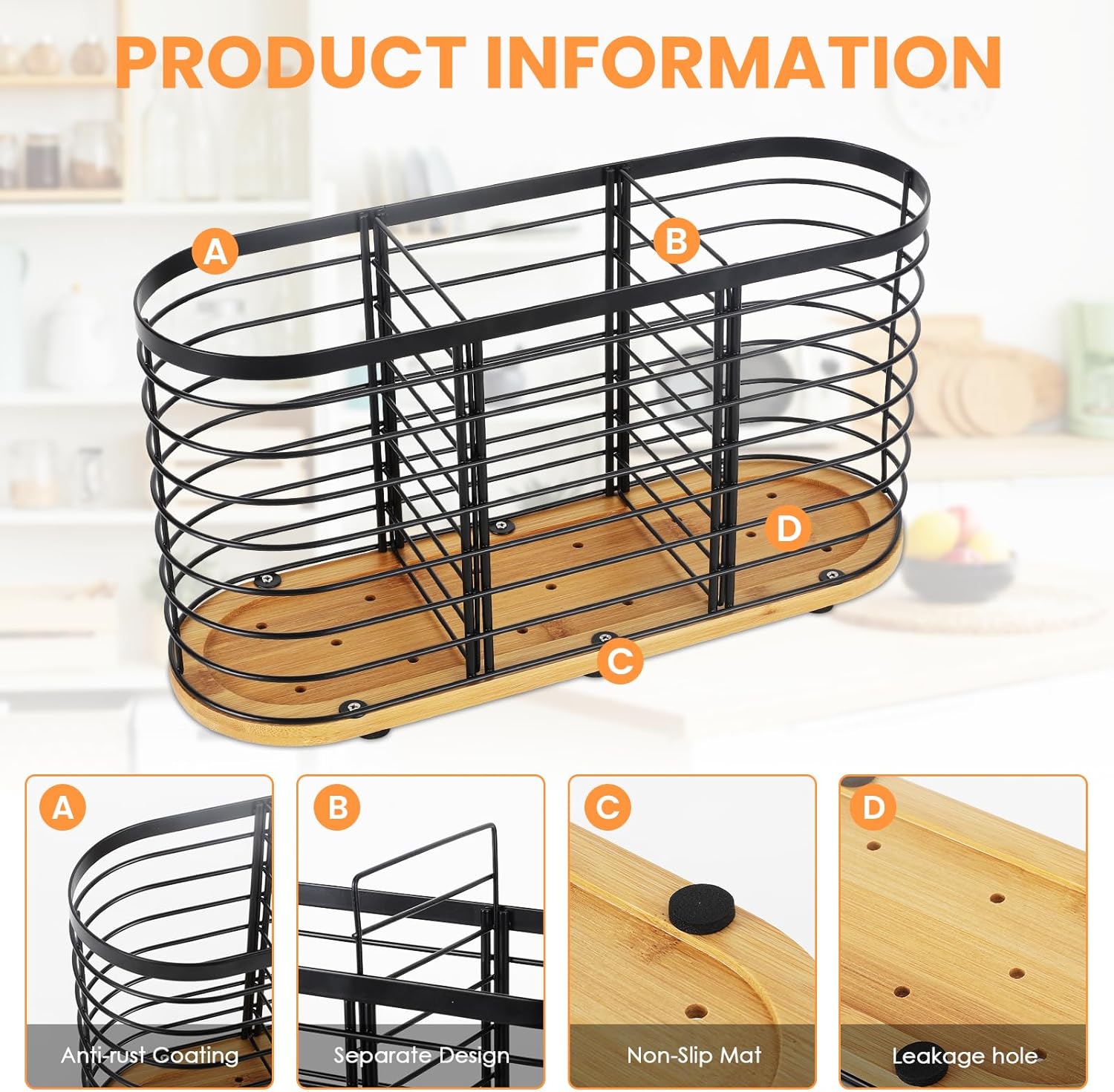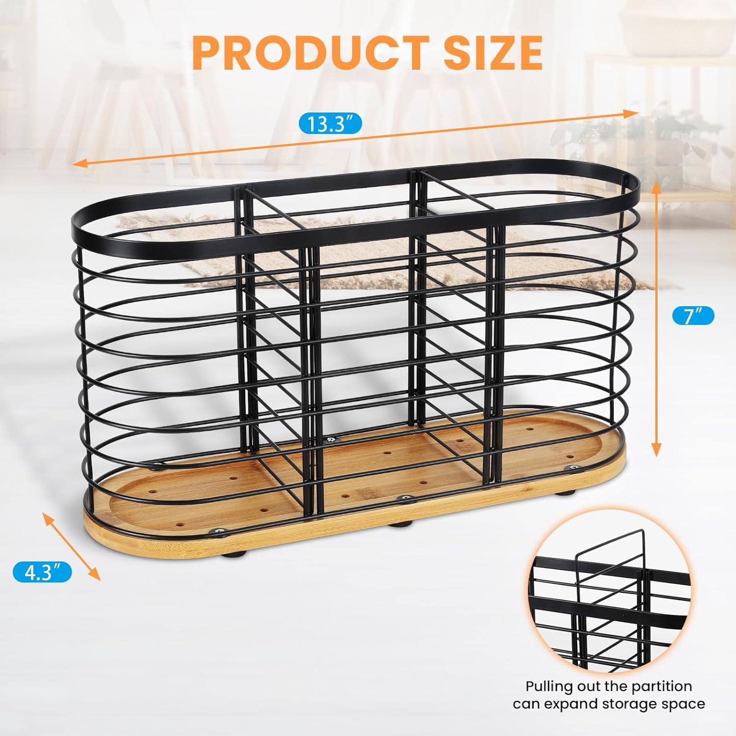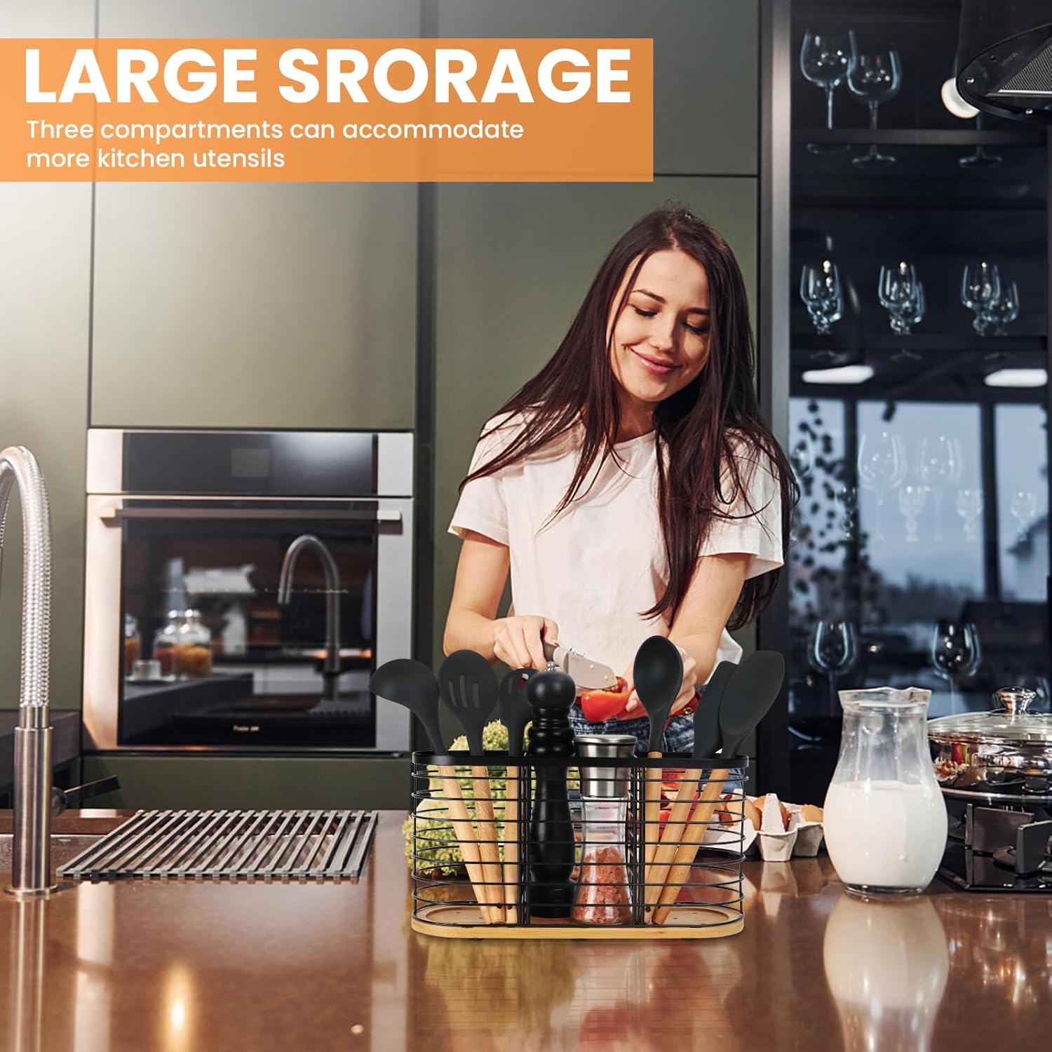 - [Ample Utensil Storage]: This kitchen utensil holder measures 13.5" x 4.2" x 6.9", offering ample space for your culinary essentials. With three compartments, it accommodates a variety of items, including cookware, knives, spatulas, tongs, egg beaters, ladles, skimmers, peelers, corkscrews, silverware, forks, chopsticks, and more. Maintain a neat and organized kitchen countertop effortlessly.