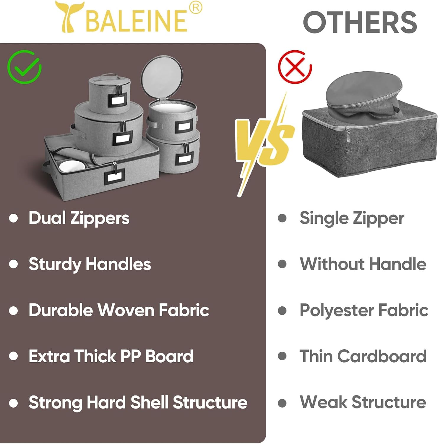 BALEINE China Storage Containers, Sturdy Quilted Wine Glass Storage, Plate Organizer with Carry Handles, Moving Boxes for Dishes, Cups, Mugs and Stemware (Plate Mug Combo, Hard Shell Grey)