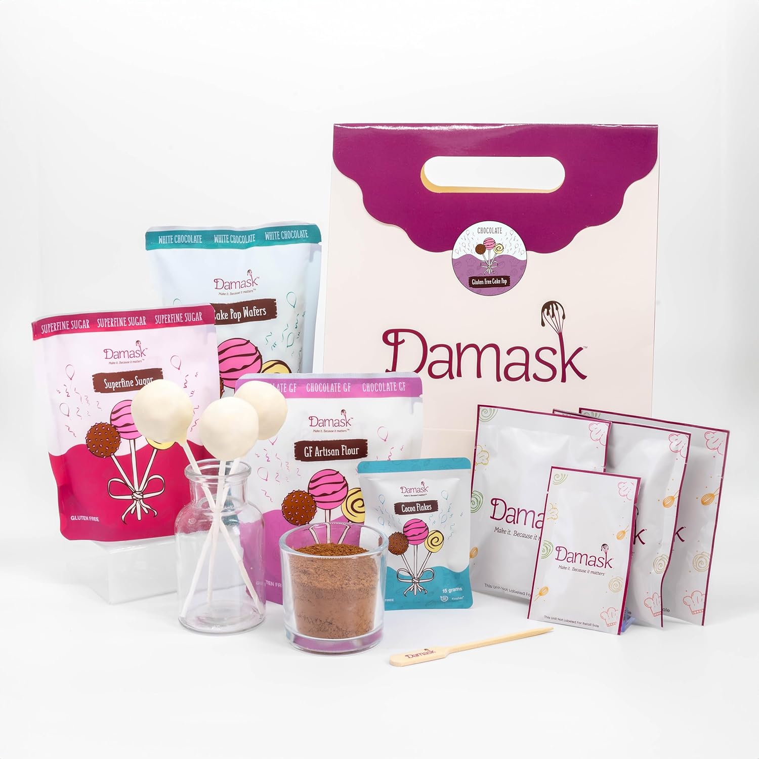 - KIT INCLUDES: Gluten Free Artisan flour, superfine sugar, Dutch cocoa powder, Dutch cocoa liquor flakes, Madagascar vanilla extract, whole milk powder, organic oil, gourmet chocolate candy coating, small-batch, naturally-colored rainbow sprinkles, 20 cake pop sticks, 20 cellophane wraps & ties, 1 parchment round, 1 skewer (to test doneness)