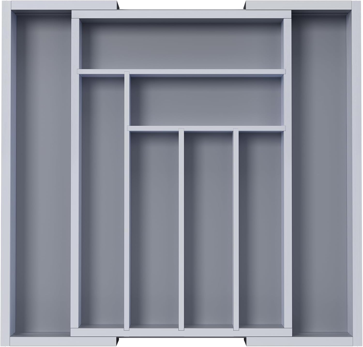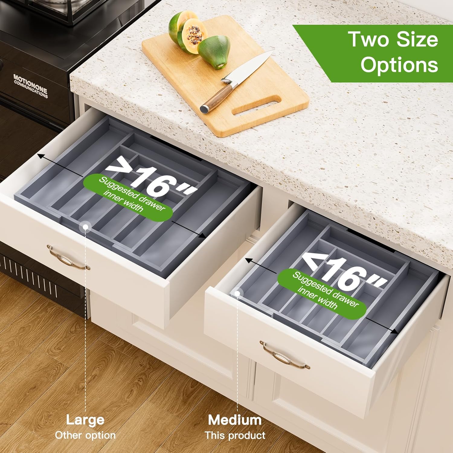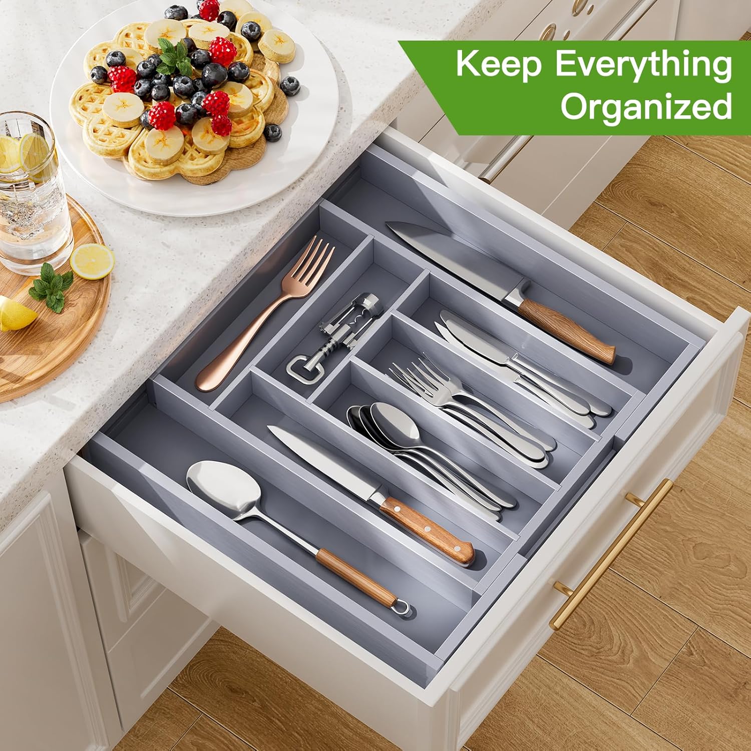 Pipishell Bamboo Expandable Drawer Organizer for Utensils Holder, Adjustable Cutlery Tray, Wood Drawer Dividers Organizer for Silverware, Flatware, Knives in Kitchen, Bedroom, Living Room(M-Grey)