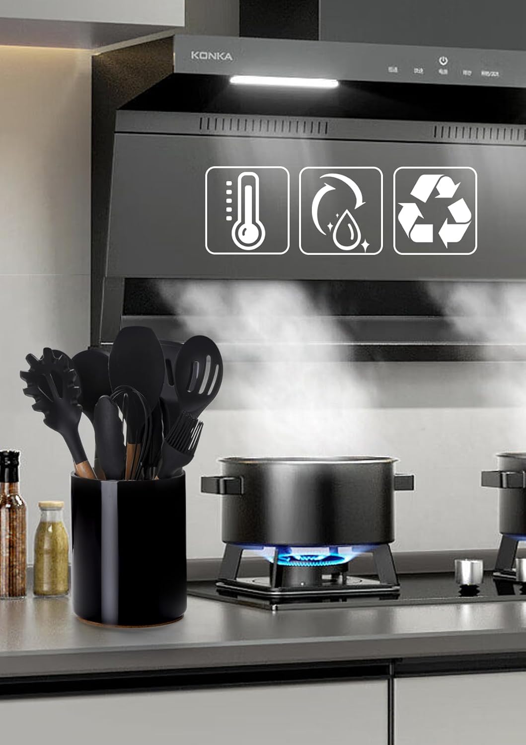 Nucookery Utensil Holder, 6.4" Ceramic Kitchen Utensil Holder with Countertop-Protection Cork Bottom, Farmhouse Kitchen Decor for Counter (Black)