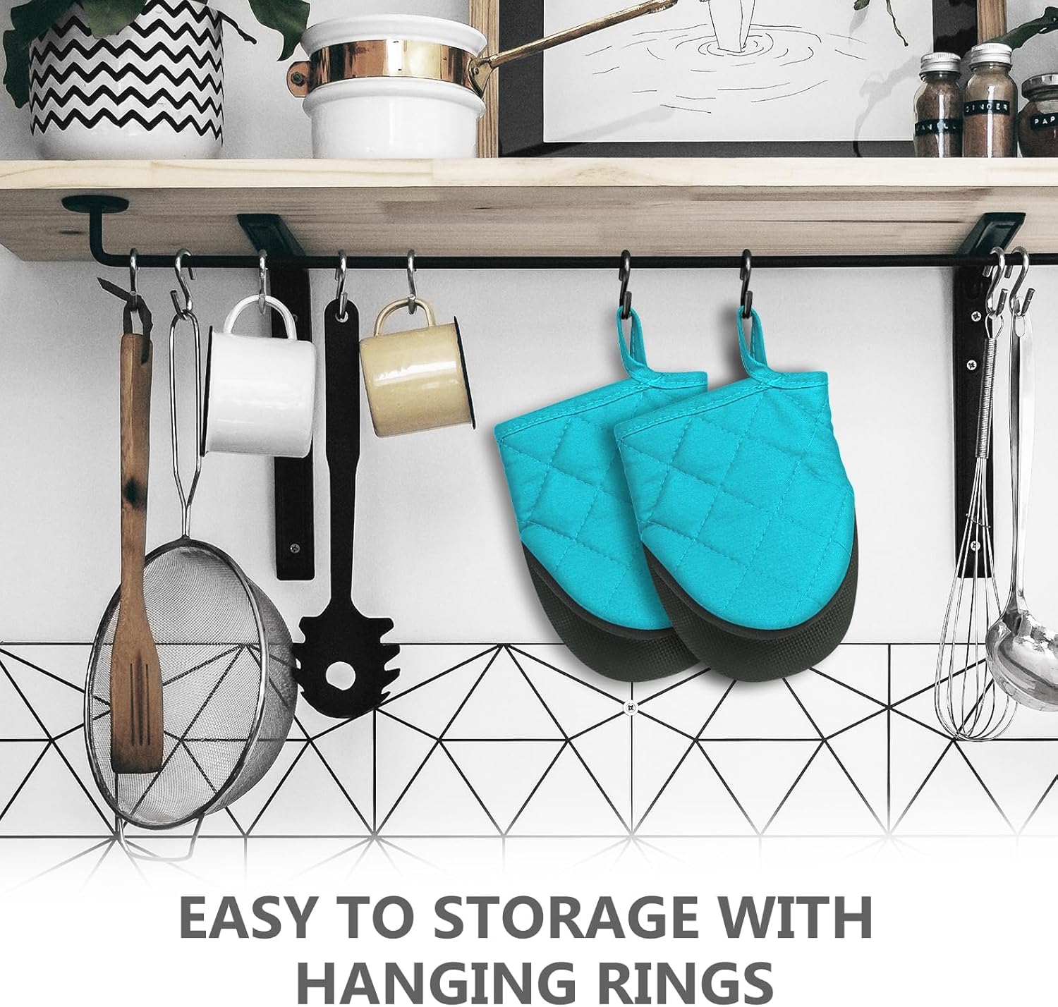 - 【Easy Clean & Storage】- If you get any food on them while wearing, just gently swish around in soapy water or just wipe them clean. Both the surface of silicone and inner lining can be cleaned. You can hang it up with the nice hanging hook in the cuffs.