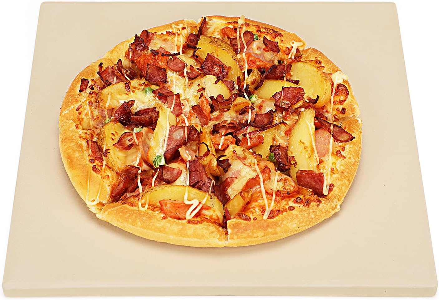 - [Pizza Stone for Oven and Grill] Pizza baking stone measures 12 inches x 12 inches x 0.6 inches and weighs up to 5.5 pounds. The versatile pizza stone is perfect for baking frozen and fresh pizza. A great choice for use at home, RV, family gatherings and parties.