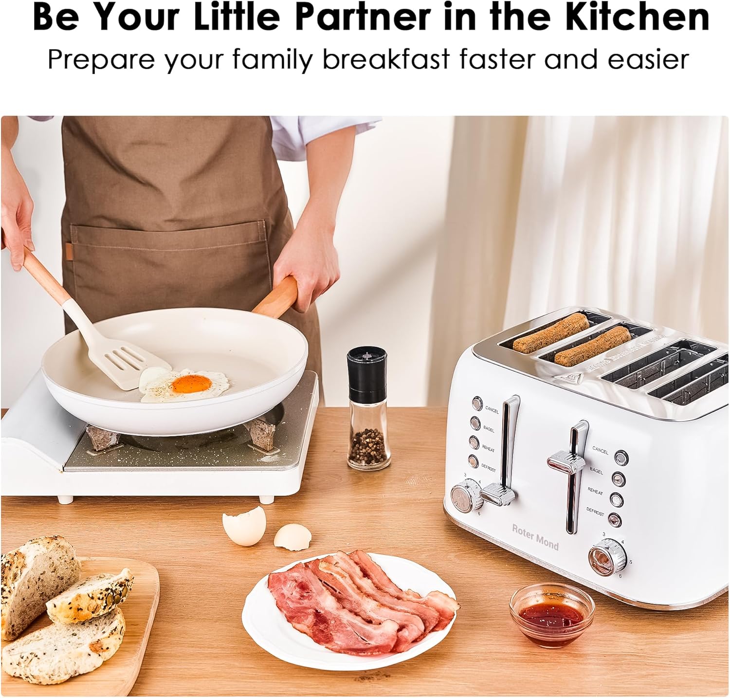 - 1.5 Inch Extra-wide Slots: With size of 5.5 x1.5 inch slots, Roter Mond 4 slice retro toaster can easily handle bagels, English muffins and other thicker or smaller such as sourdough, tortillas and Texas toast. Its stainless steel design can avoid being rusted, and all stains can be easily cleaned with one wipe. Food-grade and BPA free materials could provide better safety for family members while enjoying delicious breakfast