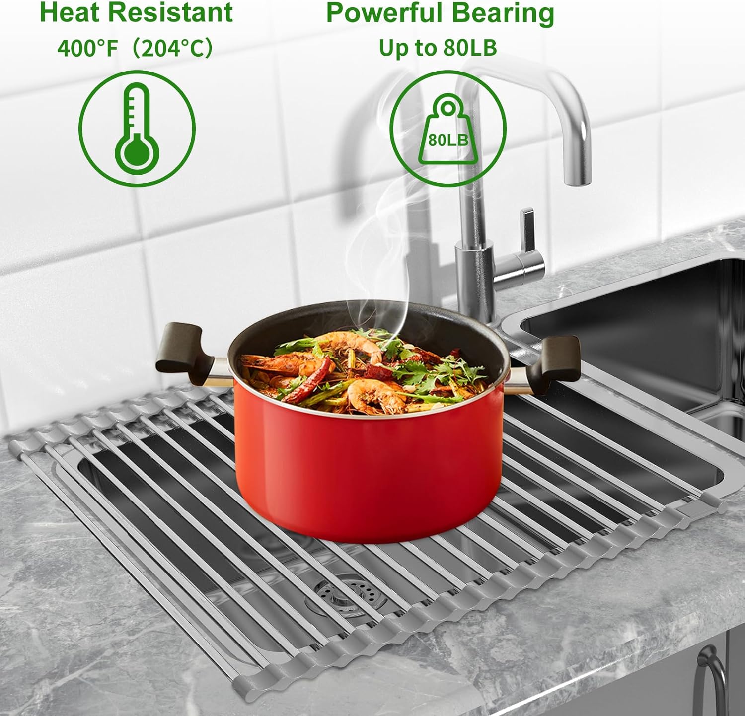 - Stainless Steel Over Sink Rack:Our over sink dish drying rack is made of 304 stainless steel, rust-resistant, heat-resistant, and corrosion-resistant.The two ends of dish rack over sink is wrapped with anti slip silicone, firmly gripping the edge of sink