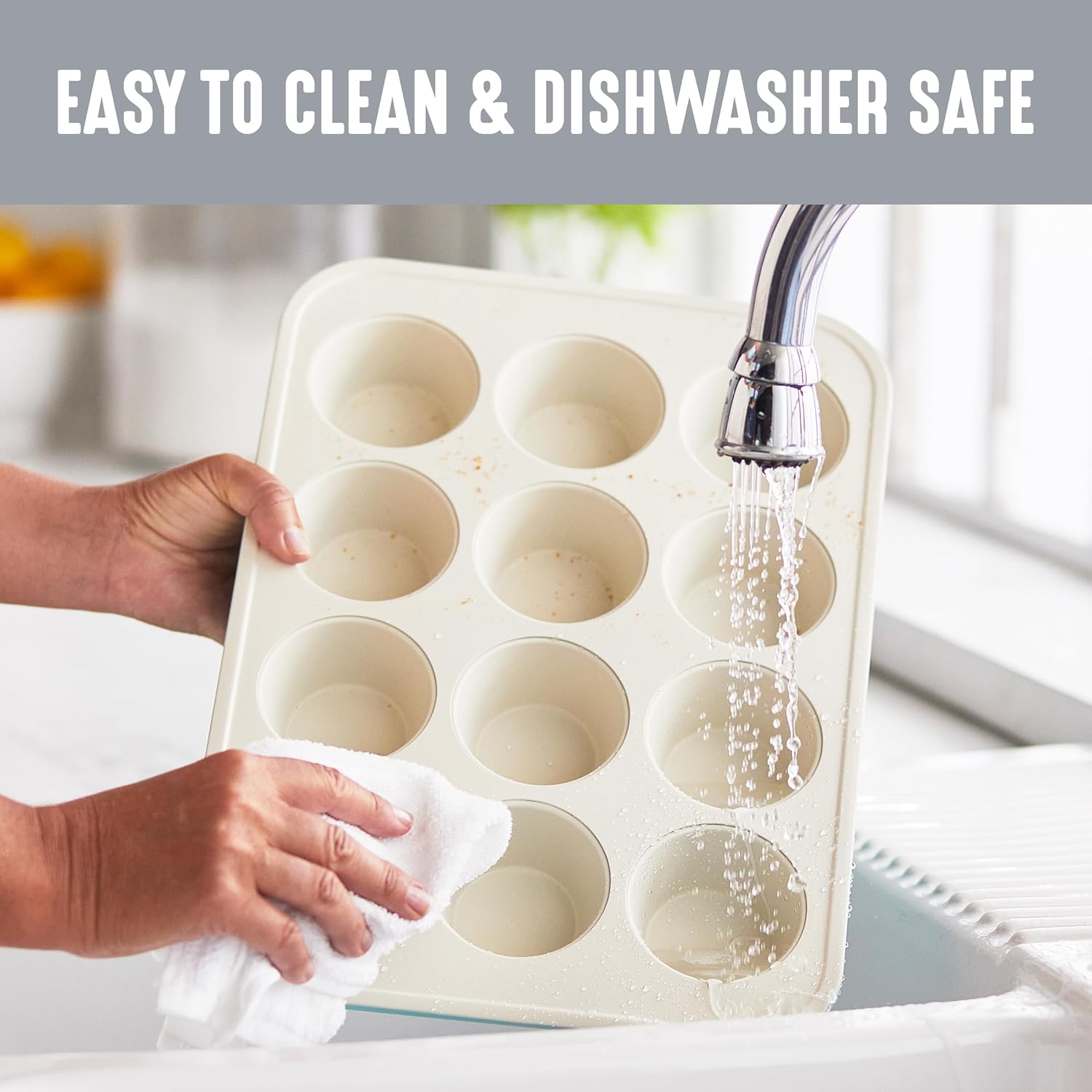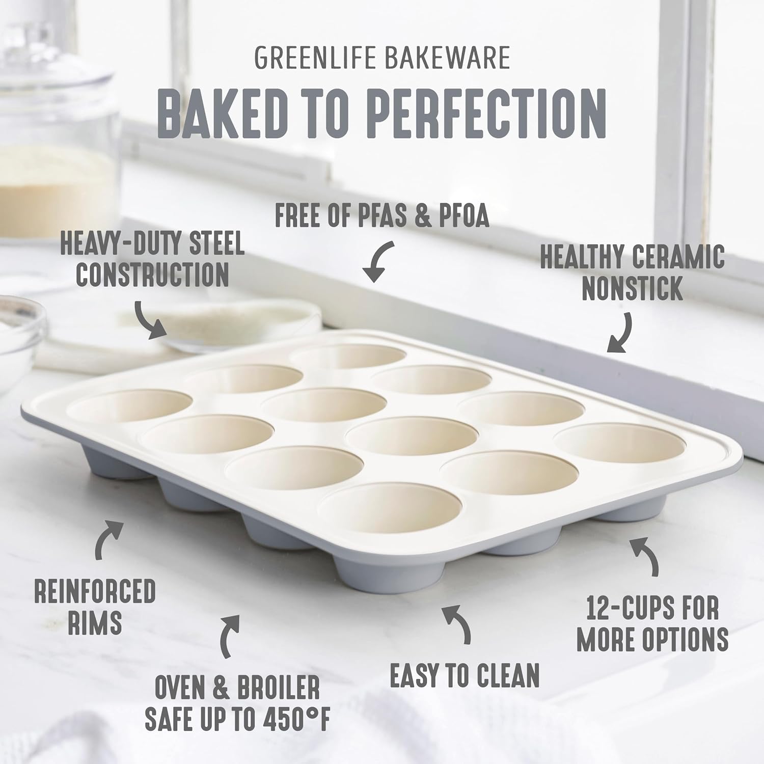 GreenLife 12-Cup Muffin Pan, Healthy Ceramic Nonstick Bakeware, PFOA & PFAS-Free Cupcake Sheet, Durable Baking Tray, Versatile Kitchen Essentials, Easy Clean Muffin Mold, Nonstick Baking Pan, Gray