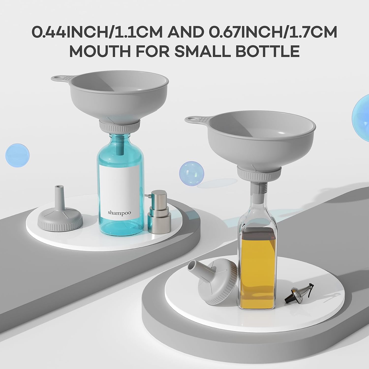 - 5 Sizes Mouth: Wide opening funnel has 5 size spouts. 2'' spout for mason jars; 1.32'' spout for squeeze bottle and pouch; 0.93'' spout for spice jars; 0.67'' spout for oil and sugar bottles; 0.44'' spout for foaming dispensers bottles