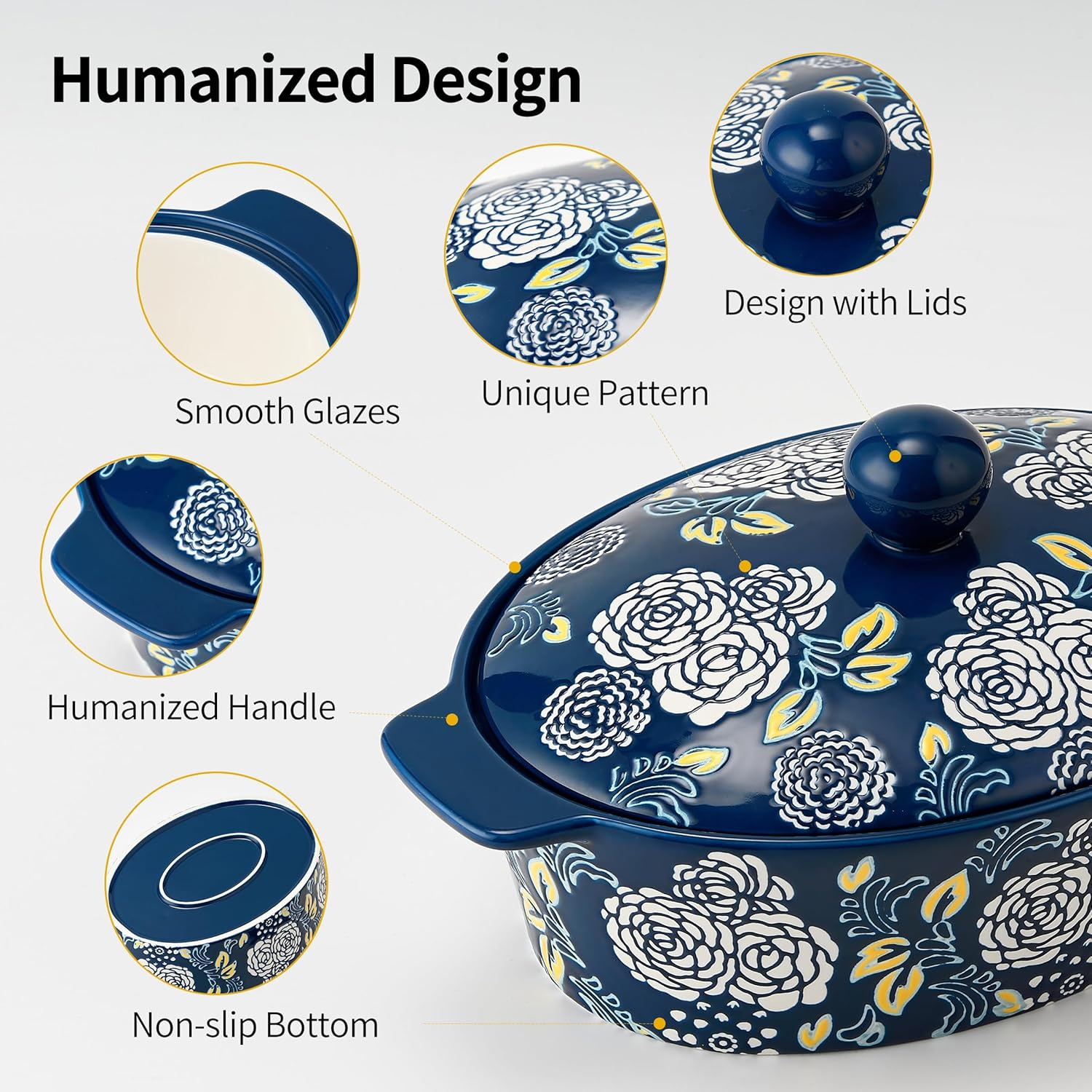 - šš§š¢šŖš®š ššš¬š¢š š§: The Casserole Dish Set with Lids features beautiful pattern design and popular color for easy daily use. Hand painted flower pattern can be a charming decoration in your table and kitchen. It will be an excellent server for your table.
