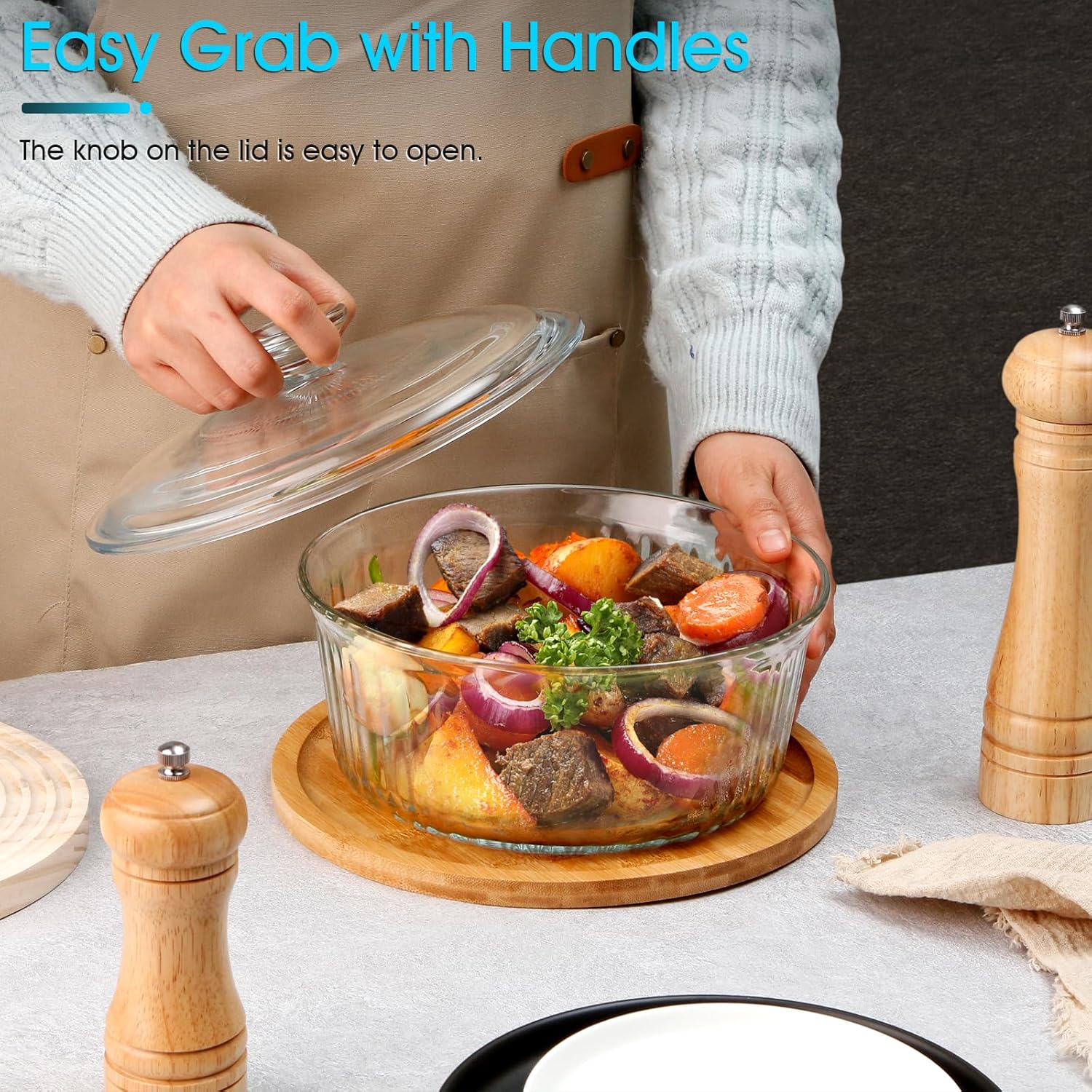 - 【Convenient Glass Lid】 Glass casserole dish helps to seal in heat and moisture while you cook. The lid is easy to lift with the knob on top of it. You can monitor the cooking process without having to remove it, keeping your food moist and delicious. The glass lid is also oven-safe, allowing you to use it while baking or roasting.